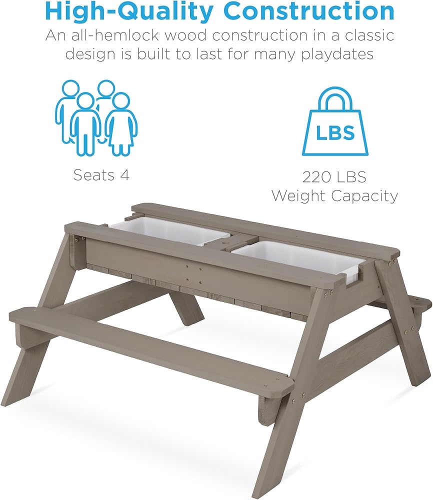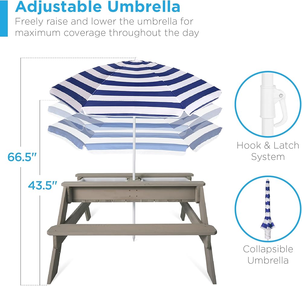 تصميم 3 في 1: قم بإزالة سطح الطاولة لتكشف عن صندوقي أنشطة بلاستيكيين وحوّل مجموعة النزهة هذه إما إلى طاولة رملية أو طاولة مياه! ملحوظة: يُباع الرمل المخصص للعب بشكل منفصل