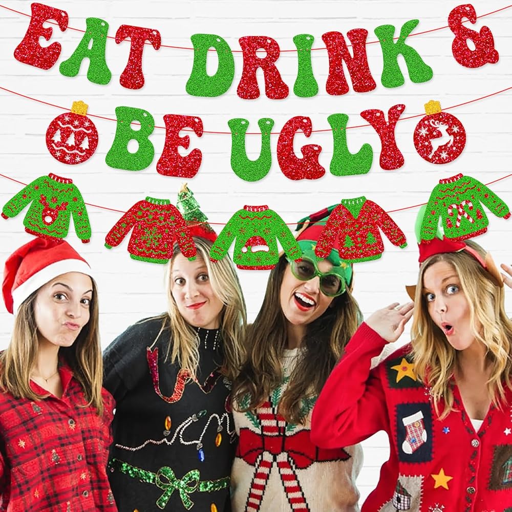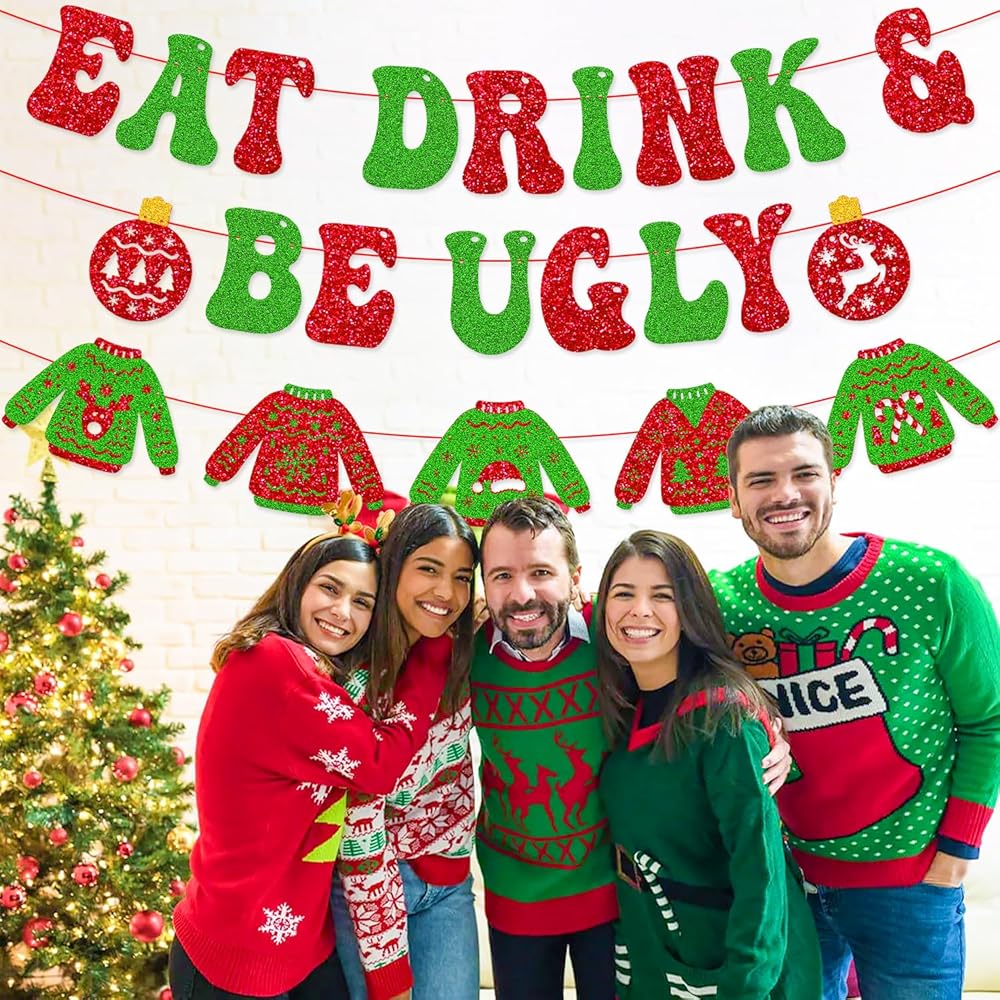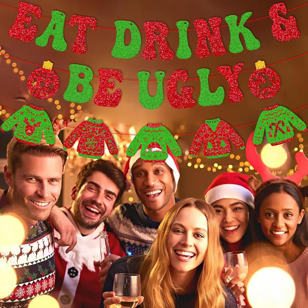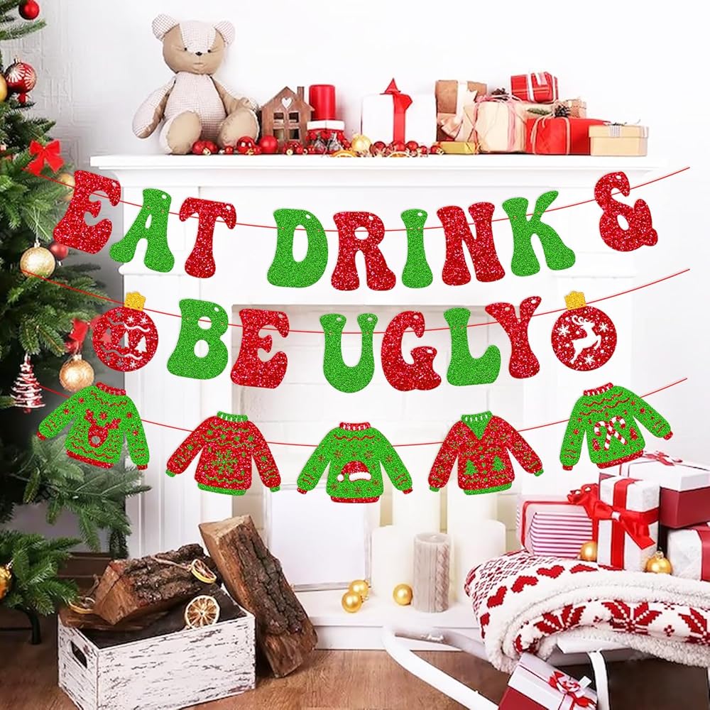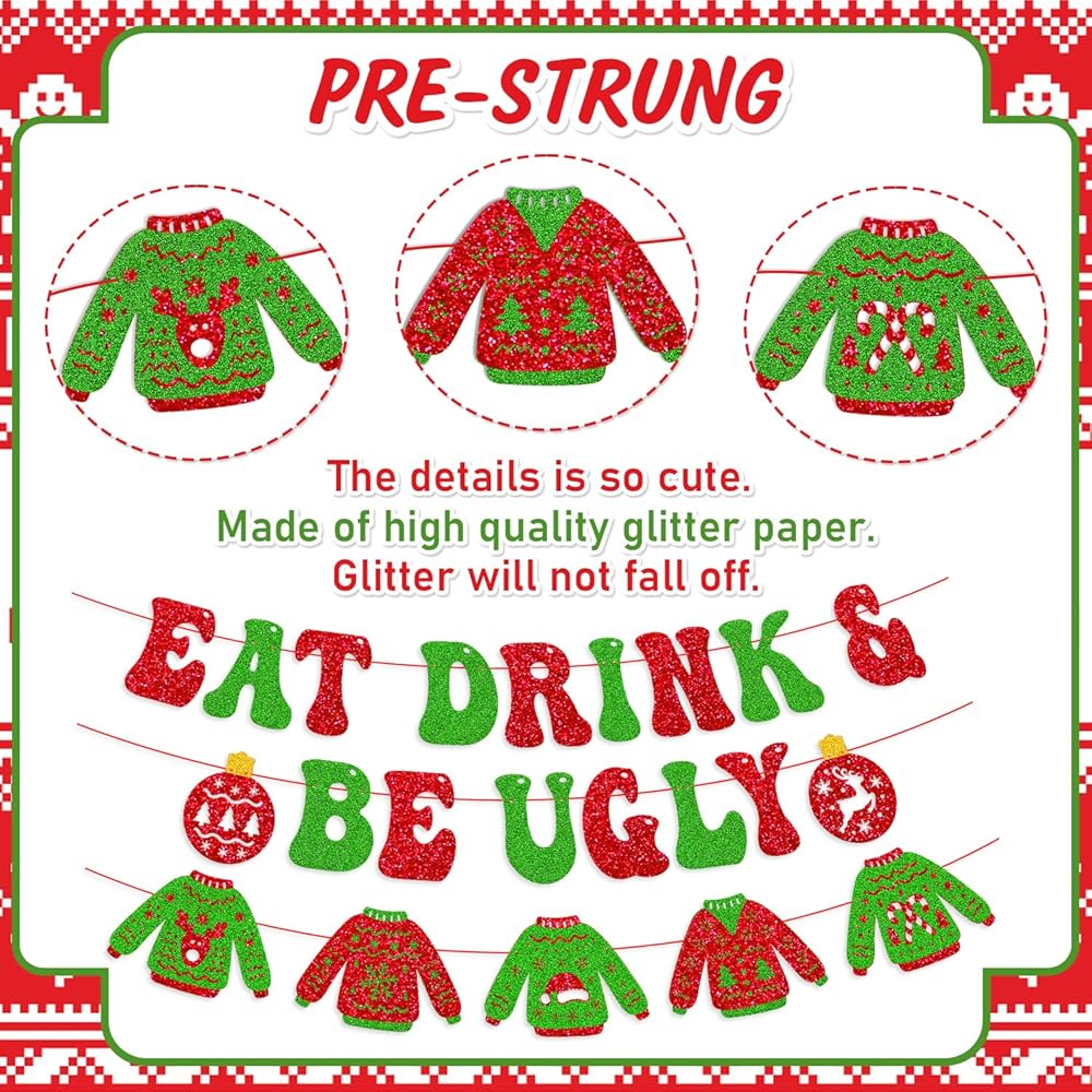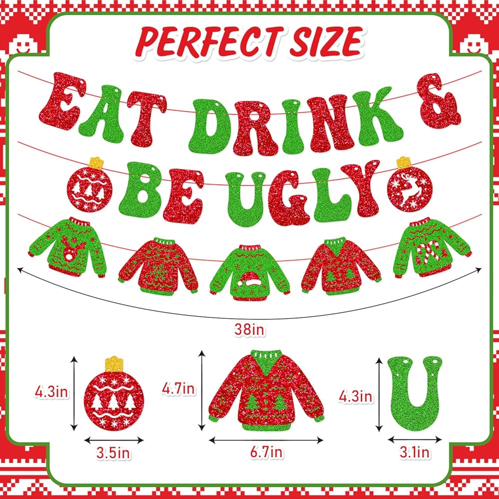 Eat Drink & Be Ugly Banner Ugly Sweater Christmas Decorations It’s Get Ugly Garland Merry Christmas Winter Happy Holiday Festival Decor Glitter Red Green Ugly Sweater Party Supplies