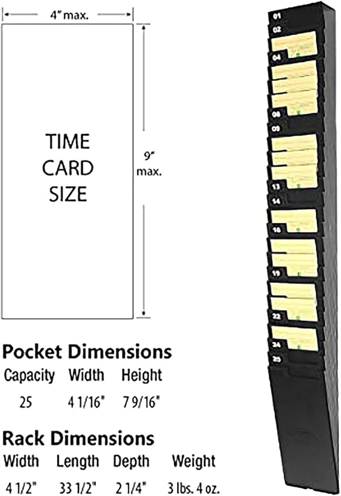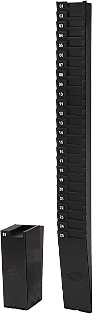 Lathem' s 25-Pocket Expanding Time Card Rack holds any standard time card (up to 9" long and 4" wide). This rack expands for easy wall mounting and can be combined with others. Excess pockets can be removed to fit your company size. The durable black plastic construction resists damage and maintains an attractive appearance in even the harshest environments. Includes pocket number labels and mounting hardware. Many companies use two racks; one on each side of the clock. As employees clock in, they move their card from the "out" rack to the "in" rack. This allows managers and supervisors a quick visual determination of who has clocked in. Since 1919, Lathem' s singular focus has been to manufacture innovative, durable and affordable employee time and attendance systems.