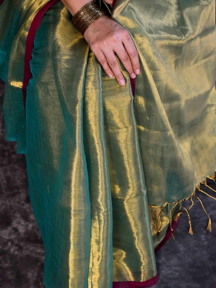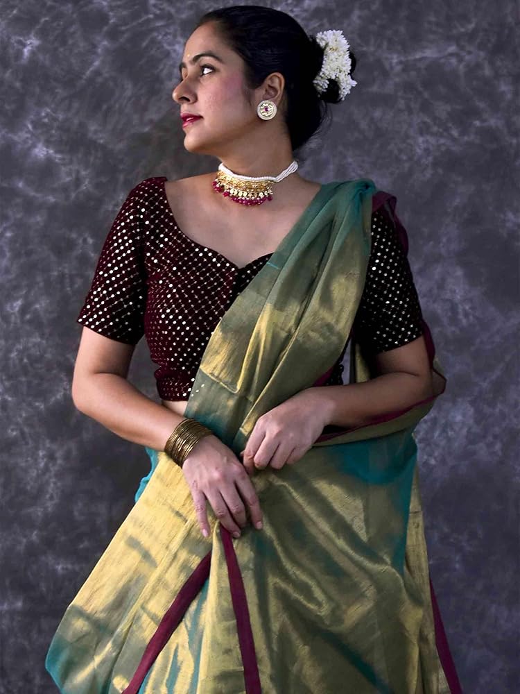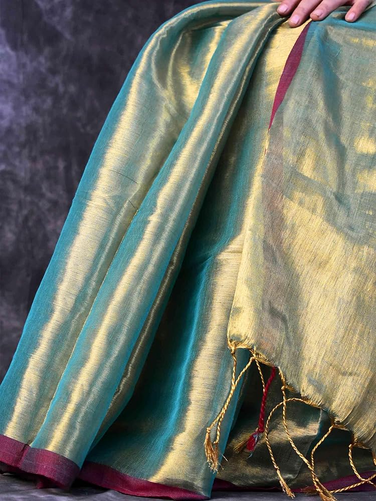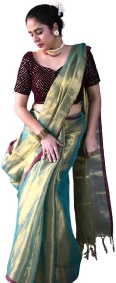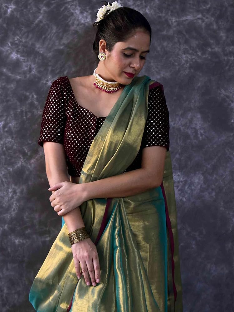 """Tie the knot with this sea blue tissue saree that'll have you feeling light and bright on the big day. Perfect for weddings, this quirky and playful saree adds a touch of fun to your special occasion. No need to take yourself too seriously, let the sea blue colour speak for itself!"" The blouse worn in pic is for reference purpose only and does not come with saree. You can shop our blouse collection from Blouses 100% handmade with love in Indian villages."