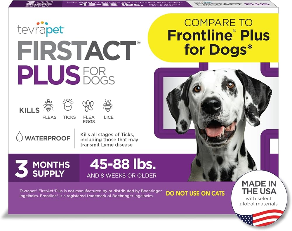 THE SAME ACTIVE INGREDIENTS AS FRONTLINE - FOR FAR LESS: It's worth repeating: Just like Frontline Plus, FirstAct Plus's powerful active ingredients REPEL and KILL fleas and ticks on contact and stop reinfestations. At TevraPet we firmly believe you shouldn't have to pay the "Brand tax" to protect your dog, and we are committed to providing affordable, veterinarian quality solutions without sacrificing an ounce of safety, effectiveness, or reliability