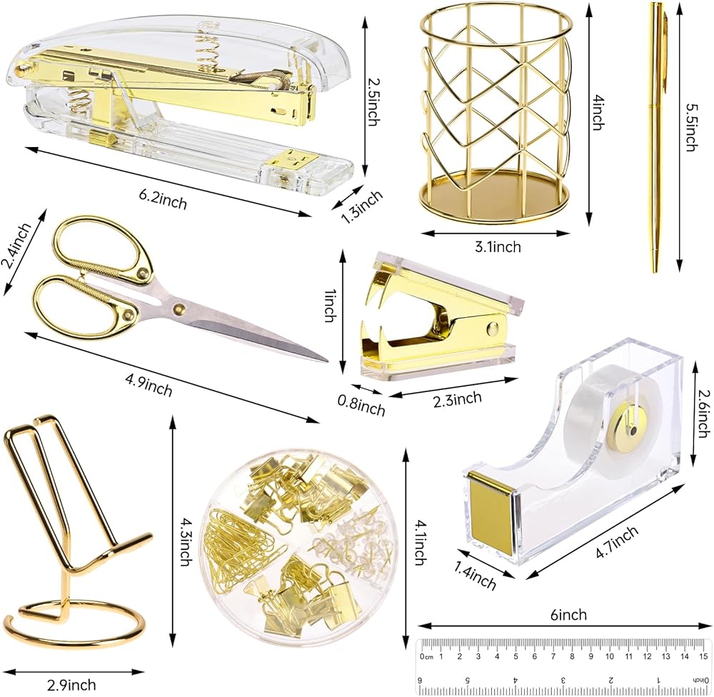 Packing Listing: 1x stapler, 1x staple remover, 1 x tape holder, 1x ruler, 1 x scissors, 1 x box of binder clips, 1000 x staples, 1 x phone holder, 1 x pen holder, 2 x pen, 1 x transparent glue ; This gold office set is rich in content and perfect for your desk, improving your productivity and making your office convenient and efficient.