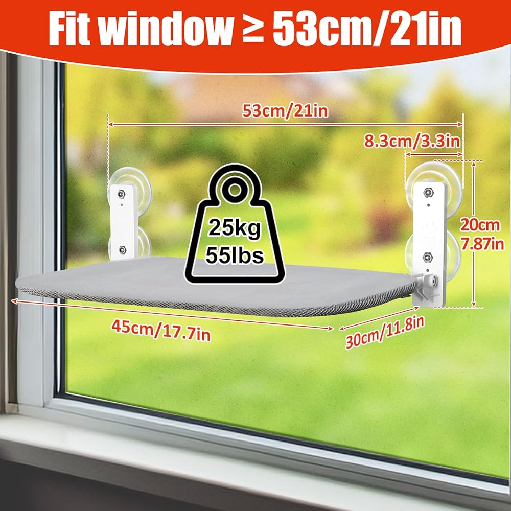 Larger Space & Bearing Capacity: Our cat window perches measure 20.5*11.8 inches(52*30cm) and can hold large cats or even two cats. Supported by 4 upgraded strong suction cups and thicker steel frame, it is safer and more stable, holding up to 55lbs