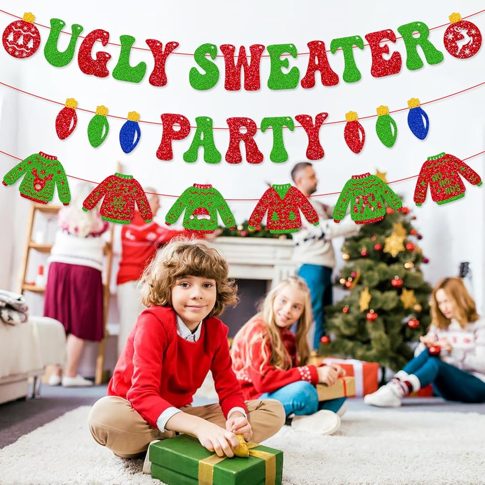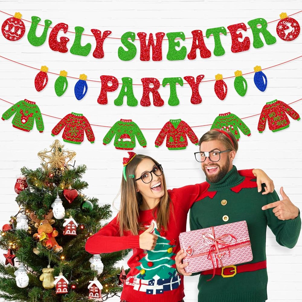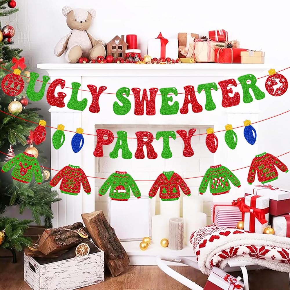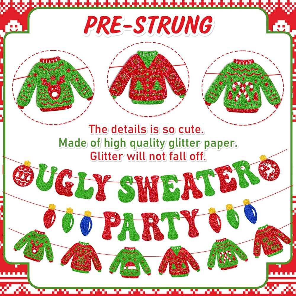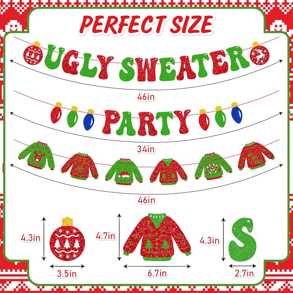 Festive Decorations: This set includes a banner with the words 'UGLY SWEATER PARTY' and ugly Christmas sweaters garland in red, green.