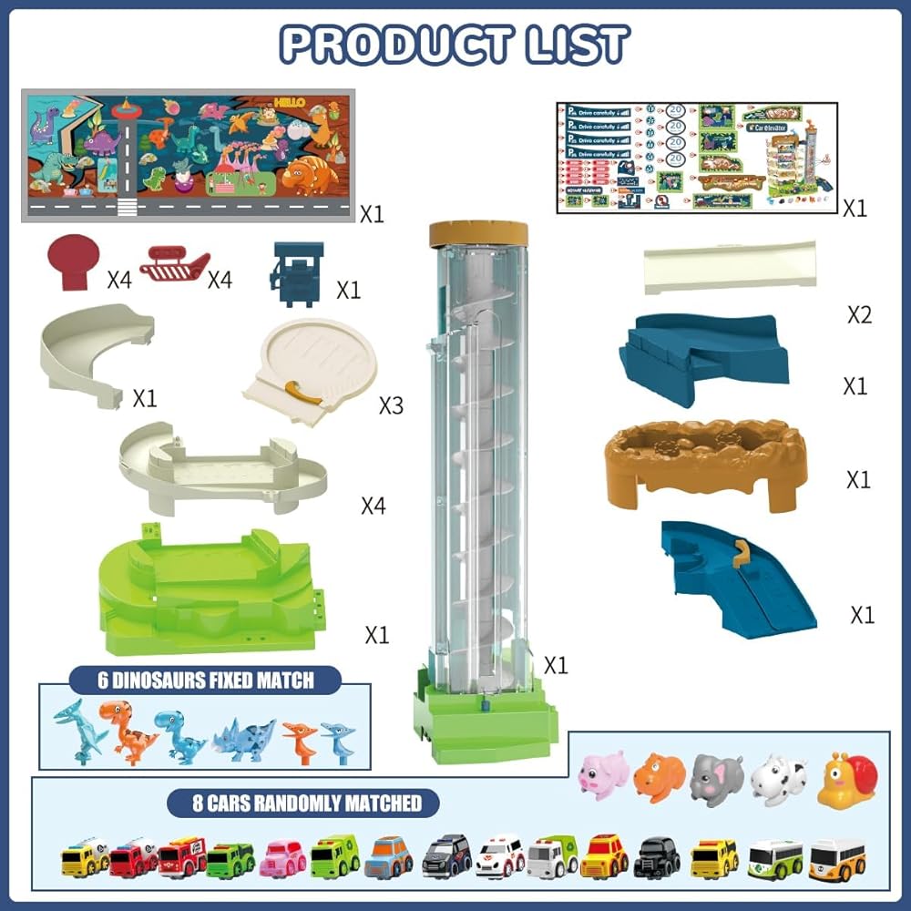 Dinosaur-Themed Race Track Toy Set - Ignite your child's imagination with our exciting dinosaur-themed winding mountain road race track set! It comes complete with 8 mini cars (random selections), 6 adorable dinosaur figures, a vibrant activity playmat, and assorted road signs, encouraging curious minds to explore science and the art of building their own unique roads