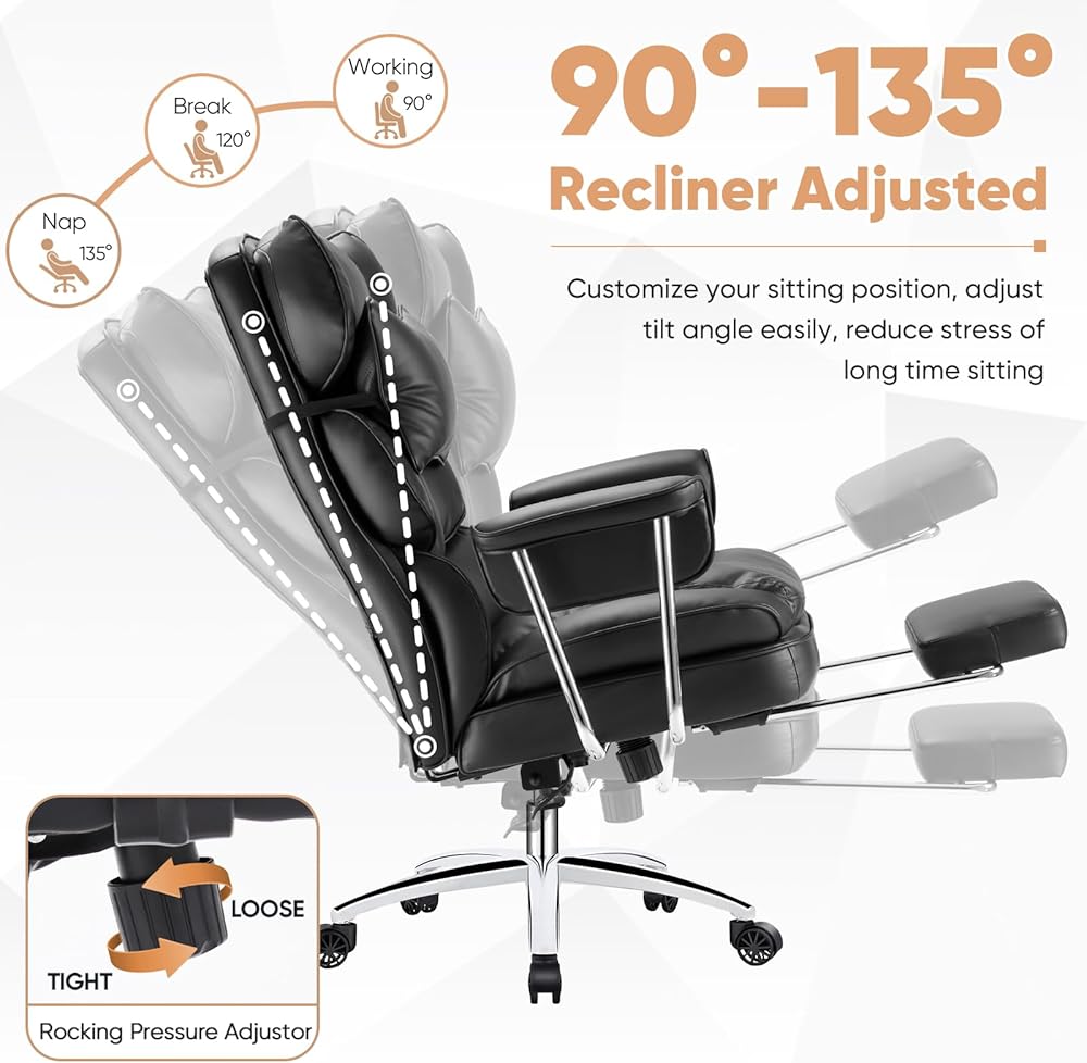 Sweetcrispy Executive Home Office Desk Chair - Ergonomic Big Tall High Back with Footrest & Lumbar Support, Reclining Height Adjustable, Comfy PU Leather Computer Gaming with Swivel Wheels, Black