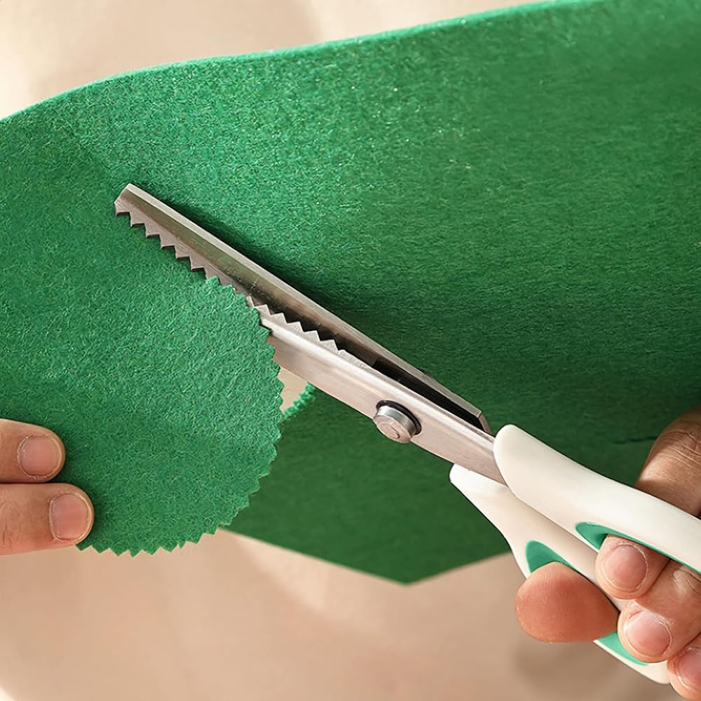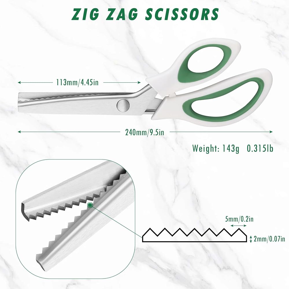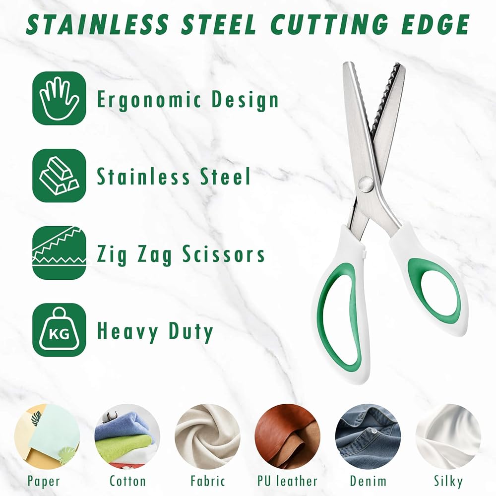 Zig Zag Scissors: The Zig Zag Scissors is 5 millimeters, with a tooth depth of 2.5 millimeters. Its edges are precisely sharpened, enabling it to create a serrated pattern while cutting to decorate the edges. Therefore, it is ideal for cutting materials such as soft fabric, thin fabric, denim, paper, leather, and handicrafts.