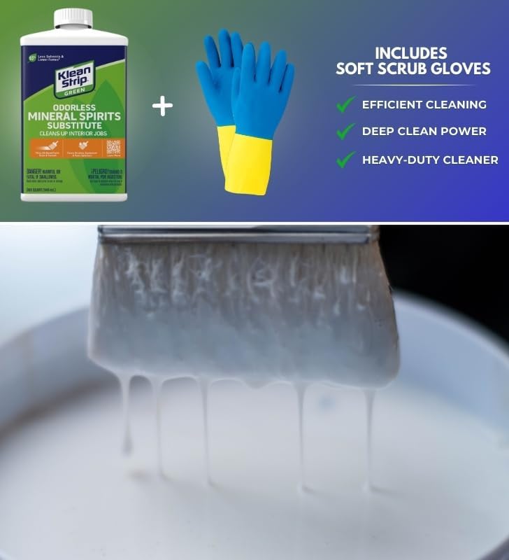 Klean Strip Green Odorless Mineral Spirits offer a revolutionary, patent-pending formula that sets a new standard for eco-conscious paint thinners. Made with 65% fewer VOCs, no hazardous air pollutants, and no ozone-depleting chemicals, this unique product is crafted with 65% more renewable resources, making it a responsible choice for both pros and DIYers. Its milky-white color ensures that it can thin any oil-based paint, stain, or varnish without altering the color of the dried finish. This versatile paint thinner is perfect for thinning oil-based products, offering superior performance while maintaining the integrity of your paint's color. With 65% lower fumes than traditional mineral spirits, it provides a safer and more efficient option for all your painting needs. Klean Strip Green Odorless Mineral Spirits is a clear, reliable choice for artists and DIY enthusiasts who seek an odorless solution for oil painting. It also effectively removes oil, grease, and even dried paint, ensuring a clean workspace. This bundle includes a bottle of 32 oz Klean Strip Green Odorless Mineral Spirits and a Pair of Gloves, providing everything you need for a safe and efficient painting experience.