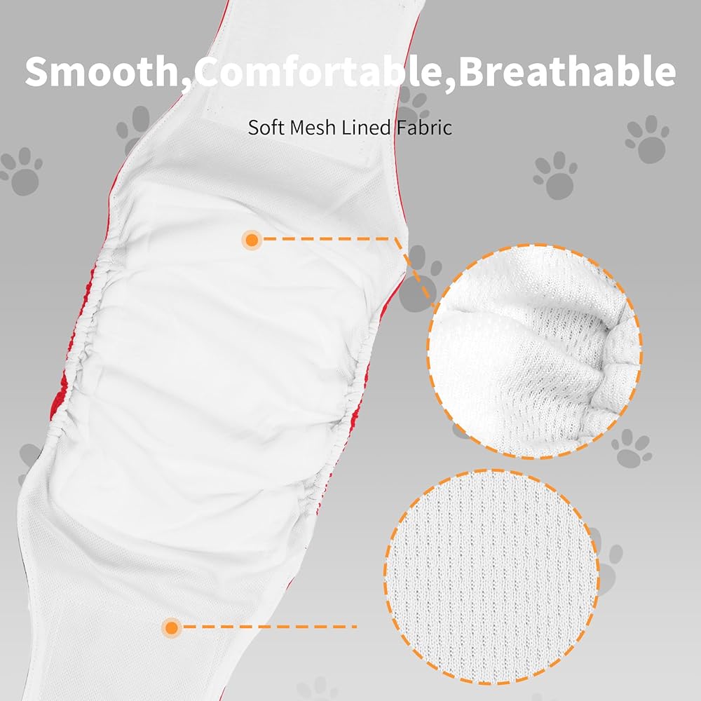 Soft mesh lined fabric is smooth to the dog's skin;Advanced nylon fabric is soft comfortable and breathable;the dog belly wrap is washable & reusable many times,more environmental & save money than disposable diapers;