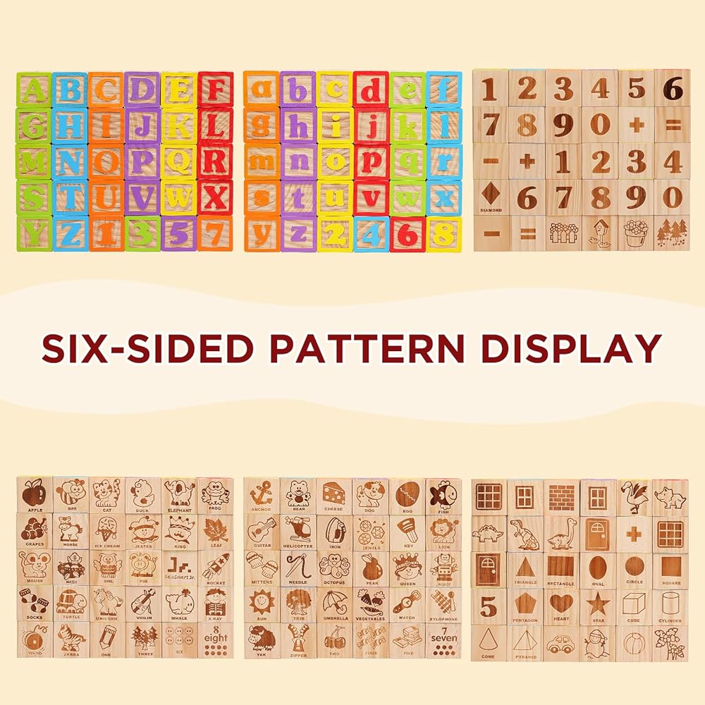 There are 40 blocks in total, 1 of each letter, with uppercase on one side, lowercase on the other, both colored, with duplicates for letters A, C, B, I, O, and T. There are also 5 blocks with colored numbers, 0-9, with 2 numbers per side, along with addition, subtraction, plus minus and equals signs, and a seemingly random question mark. The carved and stamped ABC and 1-2-3 theme encourages counting and problem-solving skills. Made of high quality solid wooden that will be enjoyed by your family for generations!