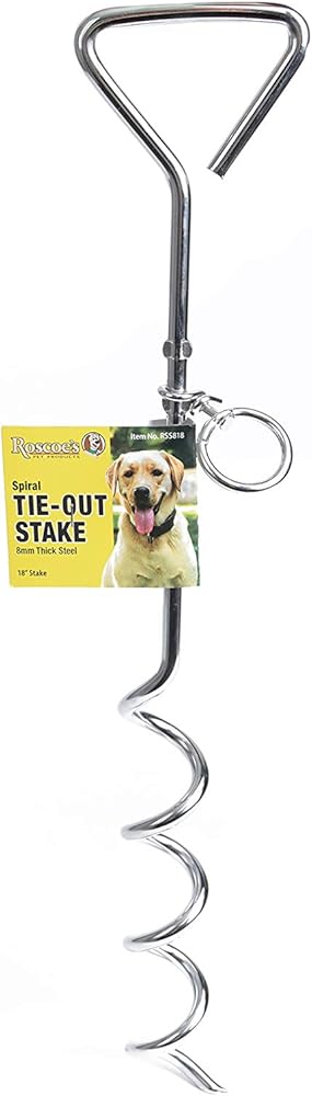 Easy to install, simple to use! Get peace of mind knowing your dog is safe and secure when attached to the Roscoe's Pet Products Steel Spiral Tie Out Stake for Dogs. Made of solid steel for strength. Never leave your pet unsupervised when tethered, never leave dog outside in inclement weather such as extreme heat or cold, and always leave fresh water within reach.