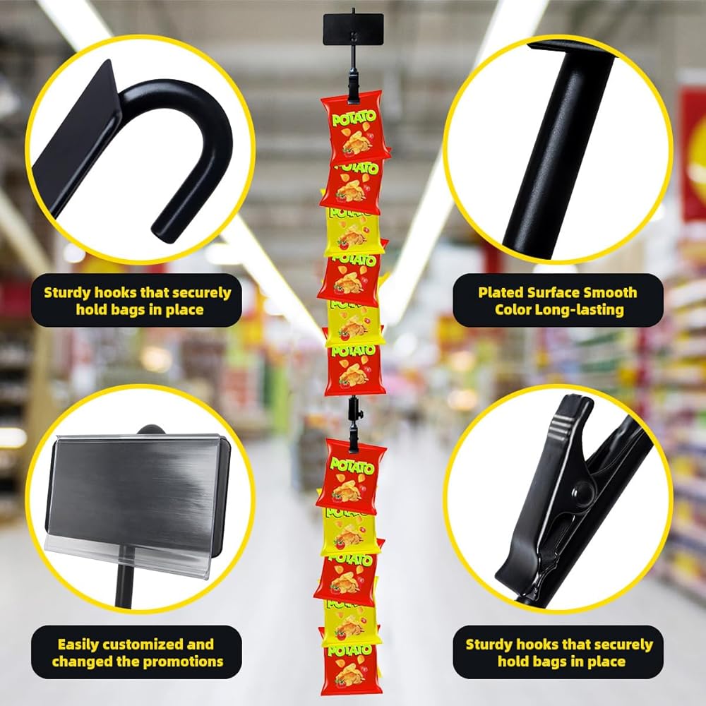 Easy to use: you simply open the hanging display strip, screw on the connection, hold the item you intend to display, and use the hook to hang it on a shelf or elsewhere. These metal retail display racks with plenty of clips, which are easy to open and will hold your items tightly. The label header on the top makes it easy to paste a price tag or product tag. With these chip holders to display your products, make them easier for customers to see, which may prominently increase the overall sales.