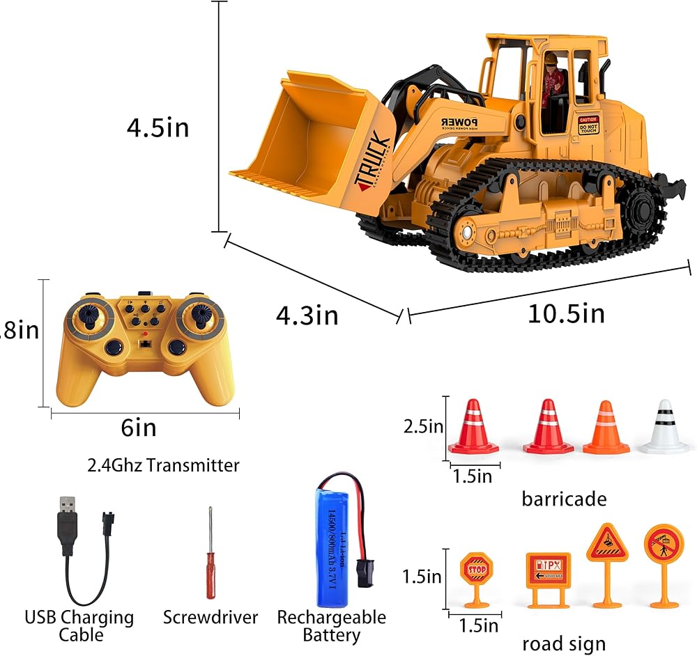 Engineering construction vehicle set with bulldozer, safety signs, roadblocks, stones, anti-interference remote control, USB charging cable, screwdriver, rechargeable battery. Let children play as soon as they receive it. Enjoy playing with family and friends