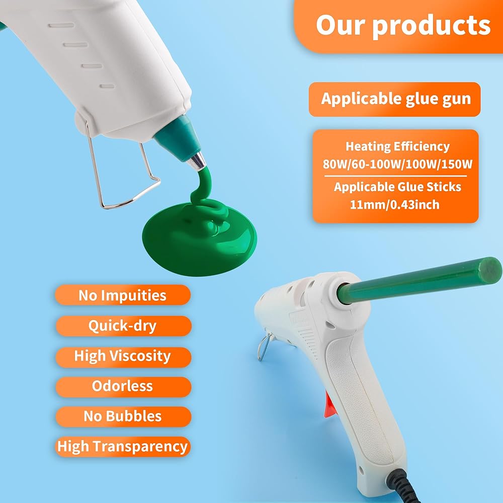 【Applicable gulue gun】These hot glue Sticks is the Standard Size, Fits Of 11mm/0.43 inch diameter 100w -180w hot glue gun, Color glue Stick Softening point : From 65°C to 80°C, Adhesive Cooling Time about 2 Minutes is the best Working Time, bulk glue sticks dry fast, with a great elastic quality when dry, This prevents breakage and add a sparkly pop to crafts writing and art.