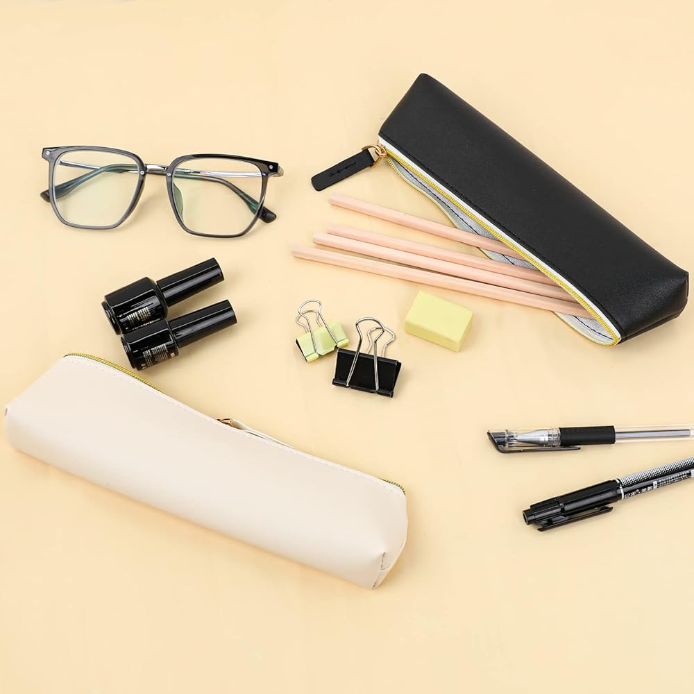 Vin Beauty 2 Pcs Leather Pencil Pouch, Slim Design Small Pencil Pouch Pencil Bag Zipper Pencil Case Bag Stationery Pouch Bag for Pens, Pencils, Markers(Black&Beige)