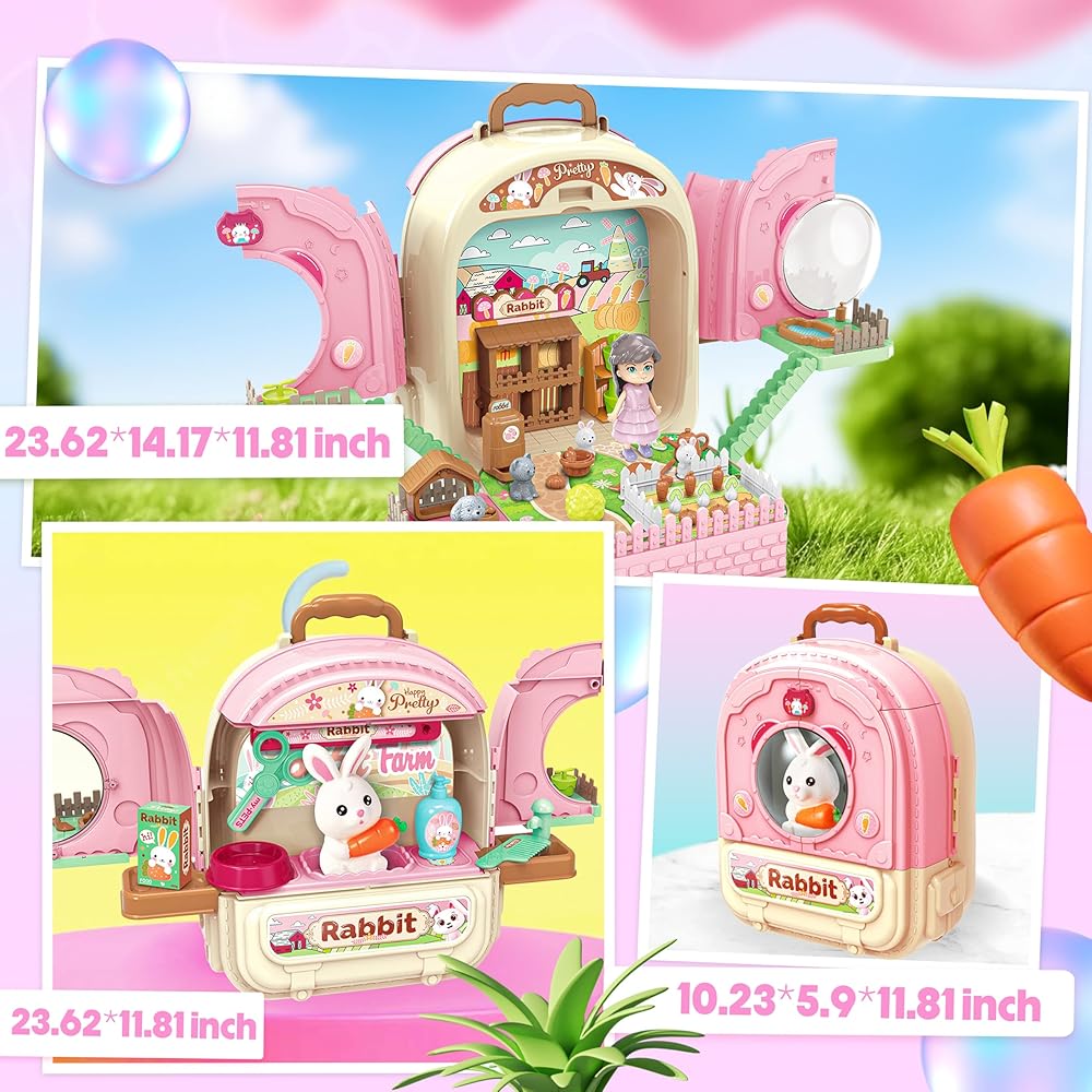 SMILESSKIDDO Pet Carrier Backpack Toy, 3 in 1 Care Playset, Pretend Play Accessories & Hair Dryer Toy, Rabbit Role Play Set for Girls Ages 3+