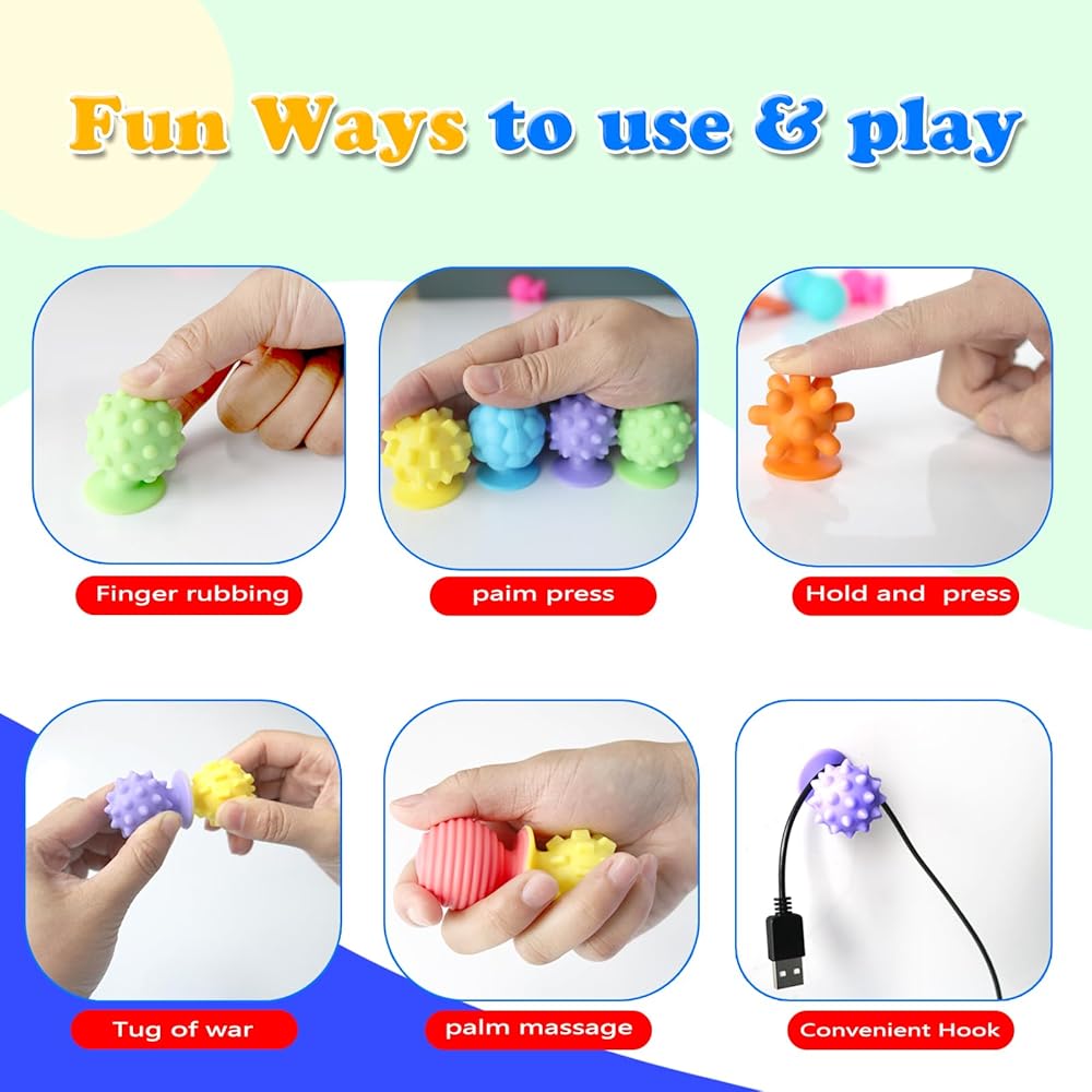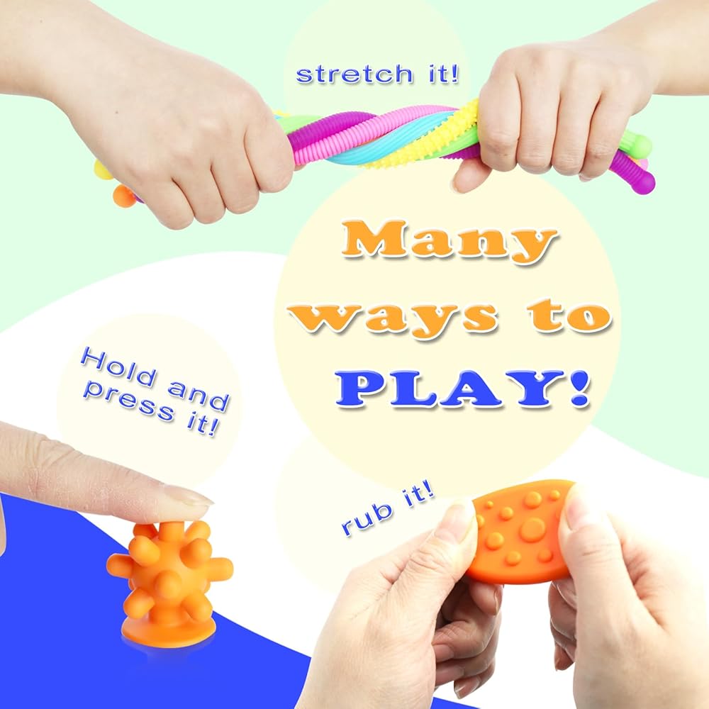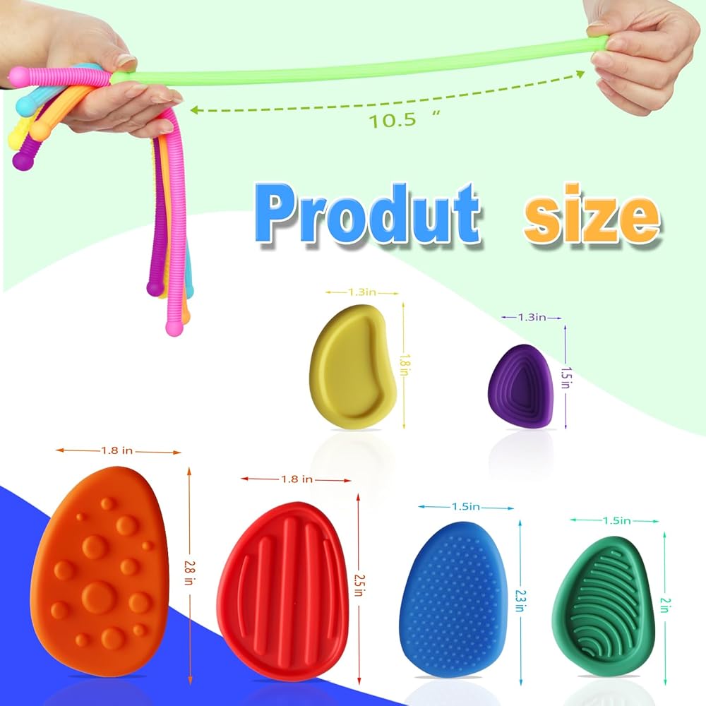 【Textures Sensory Fidget Toys】18 Textures Sensory Fidget Toys-Including 6 Textured Suction Cup Toys, 6 Textured Worry Stone and 6 Fidget String . These stretchy sensory toys are not only fun but also serve as excellent tools for calming and focusing young minds. Whether you're looking for party favors, birthday gifts, or classroom prizes, these toys are the perfect choice.