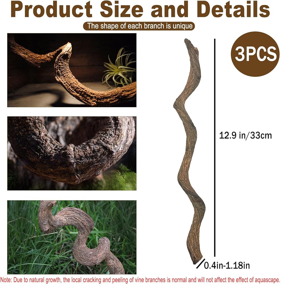 【Size and Note】The reptile branch decoration is approximately 12.99 inches long, with a diameter of about 0.39-0.79 inches for the fine vines. Suitable for lizards, bearded dragons, geckos, chameleons, snakes, frogs, and other reptiles. Note: Each natural branch is unique, with varying widths and lengths.