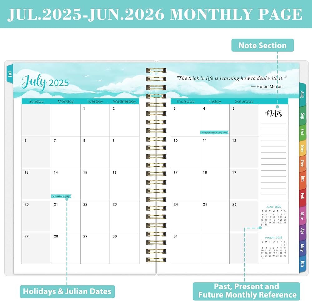 Monthly Planning Pages - The inner pages of this planner is with green ink design make the planner more colorful. Each monthly pages of this calendar 2025 planner contains an overview of the month and Holidays Reminder inside the daily blocks. Besides, there are Note Section, Monthly To Do, Monthly Goal and Review parts to help you record your monthly plannings more clearly.