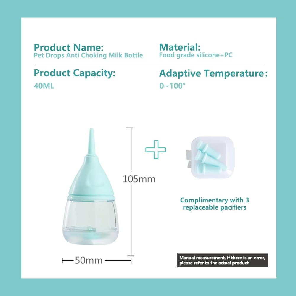Perfect for Newborn Pets : Our specially designed kitten bottles for nursing kits fulfill the feeding needs of your newborn pets aged 0-45 days. The 40 ml size is ideal for puppies, kittens, guinea pigs, ferrets, rabbits. 3 PCS additional replaceable silicone nipples are included
