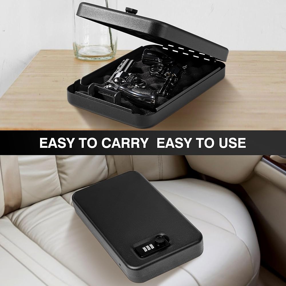【Portable and Light to Carry】 The sgorlds portable gun safe can be used at home, in the car, office, or anywhere which you want. Its external size is 9.4"*6.6"*1.8" and the internal size is 9.4"*6.5"*1.6" The weight of the gun lock box is just 2.73lb. This is a very small pistol safe that is easy to carry. You can use it to carry your pistol, cash or other valuables, so it is a good choice for long travel.