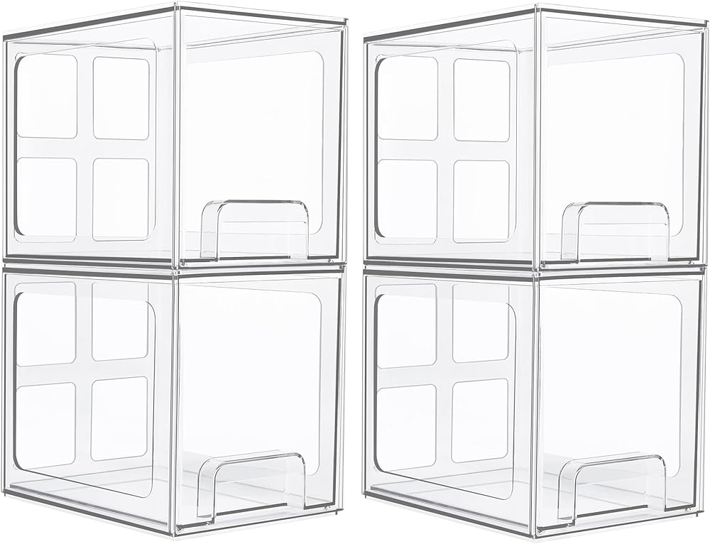 [Stackable Design] Come with 4 drawer storage organizers, each organizer measures 7.5"D x 6"W x 6.6"H. The storage bins are stackable, vertical storage will save a lot of space. It can put lotions up to 6" in height.Perfect for organizing face creams, body lotions and more.Cosmetics will be no longer covered in dust.