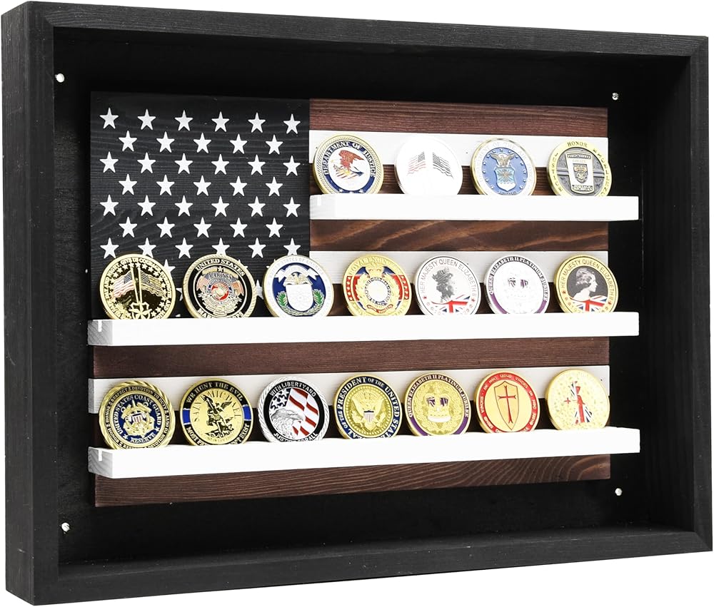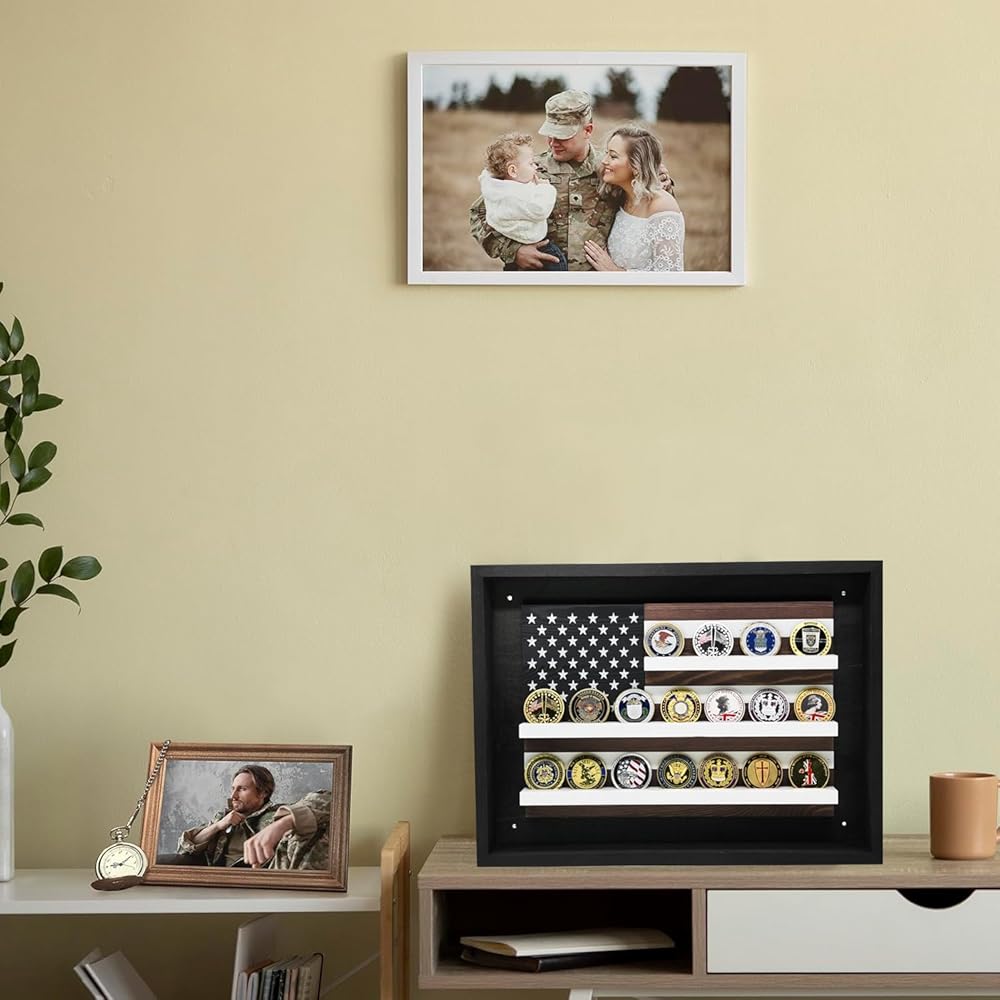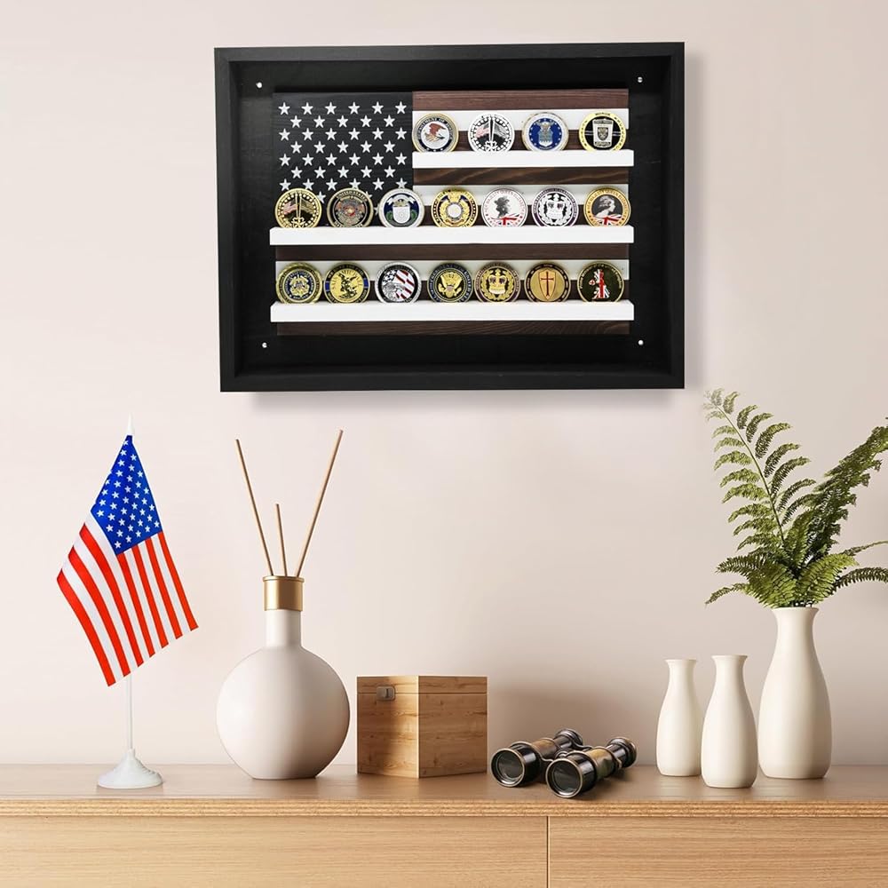 【Patriotic Art】: The military coin racks are handcrafted by 100% eco-friendly lumber. This wooden American Flag with challenge coin displays are perfect for displaying USMC coins, navy coins, army coins, air force coins, military and service keepsakes.