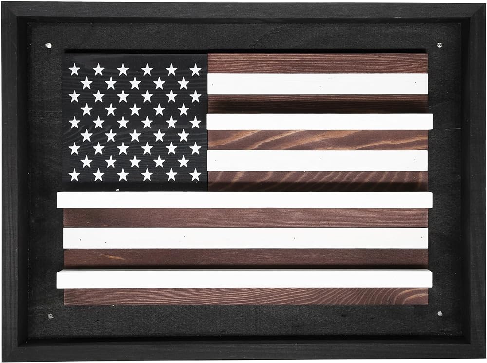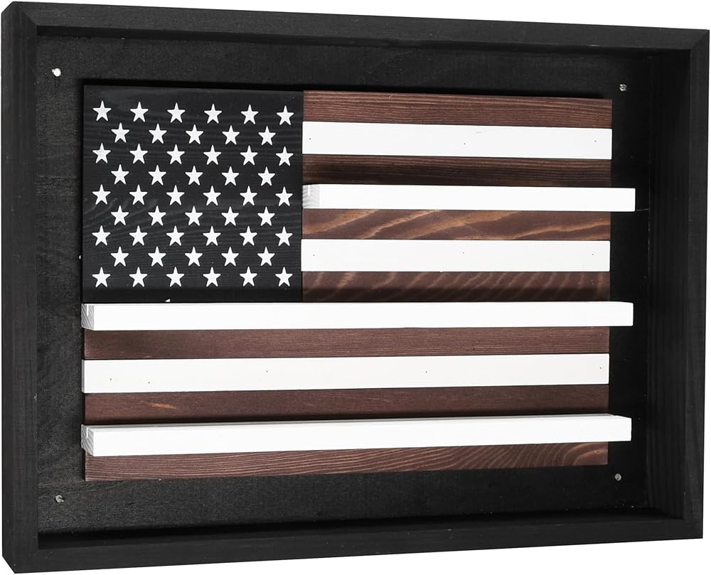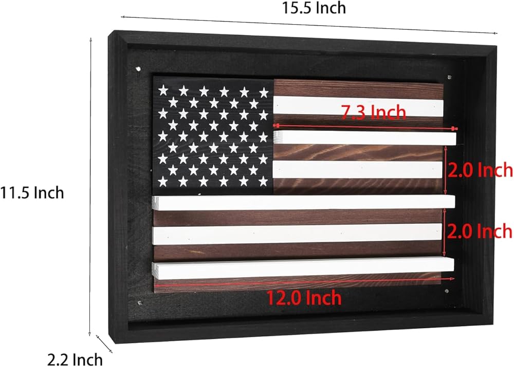 【Approximate Dimensions】: 11.5“ H x 15.5“ W x 2.2“ D (in inches) The patriotic American flag design provides the perfect backdrop for displaying military-related memorabilia. Easy to install onto wall surfaces with the included hardware.