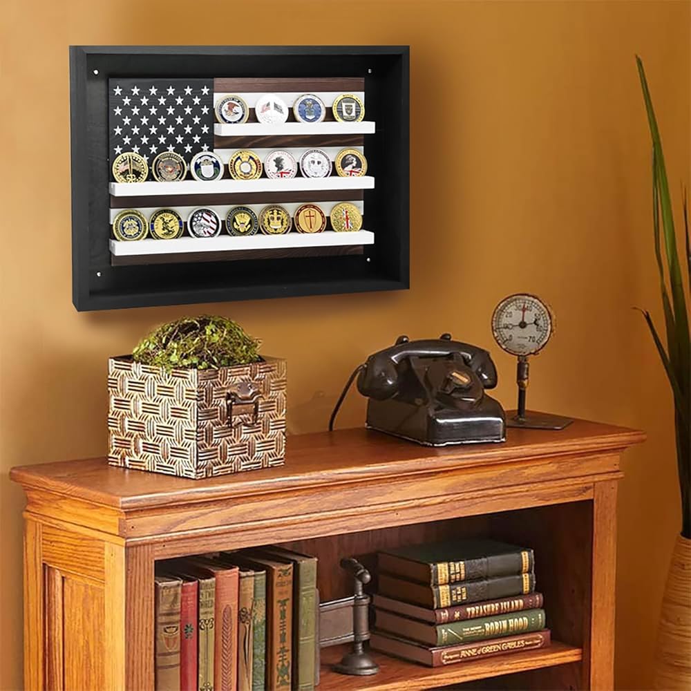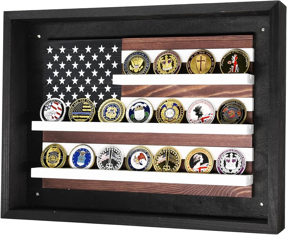【Rustic Wooden American Flag Design】: A beautiful way for military and first responders to proudly display their challenge coin collection in a beautiful and patriotic way. This wooden change coin displays offer a decorative and functional style for collectors.