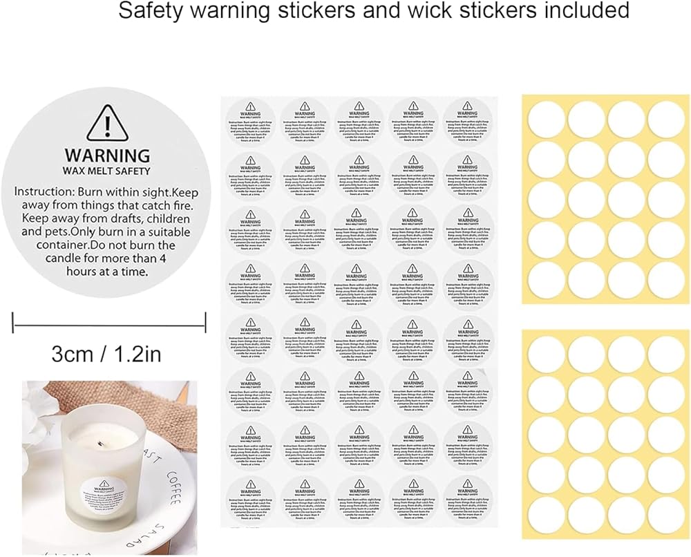 140 pcs candle making wicks kit : 30 pcs wooden wicks for candle making with 30 pcs metal base, wicks are 13x1.9cm (5.1 x 0.76inch) in size, 40 pcs wick sticker and 40 pcs warning stickers