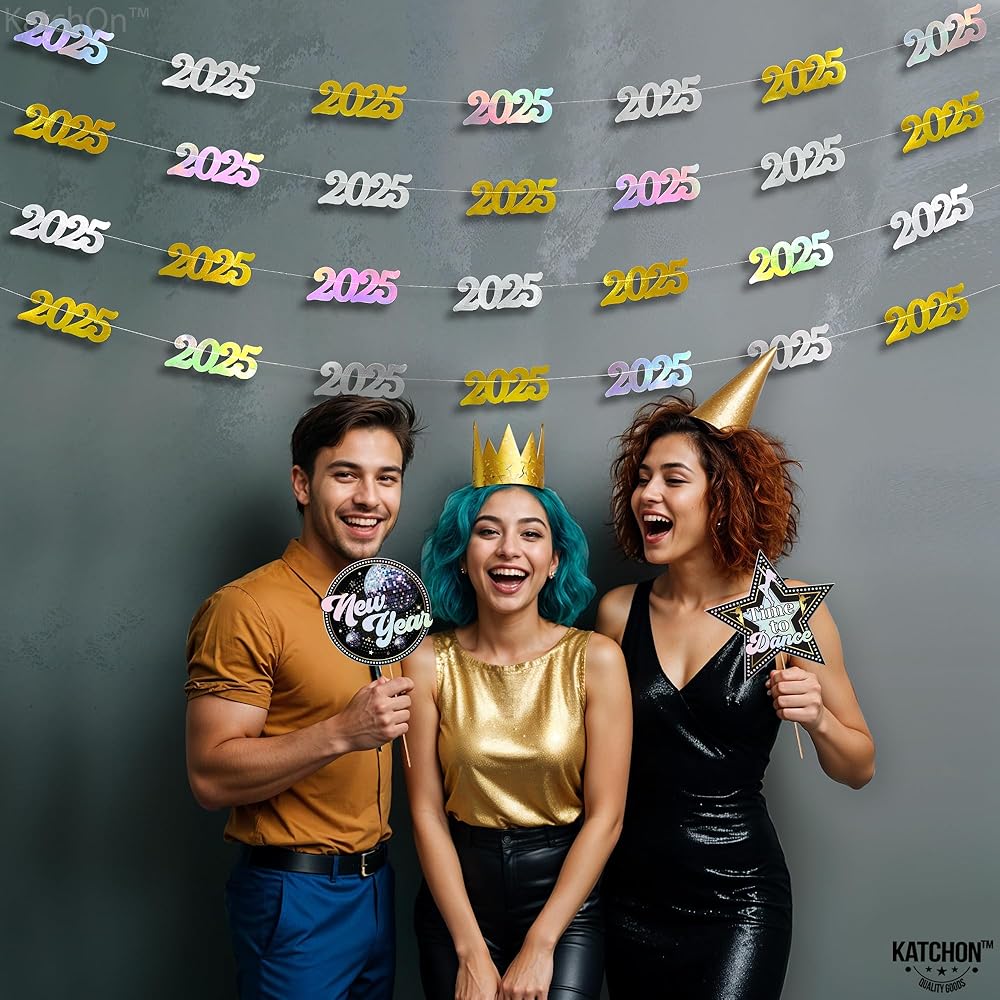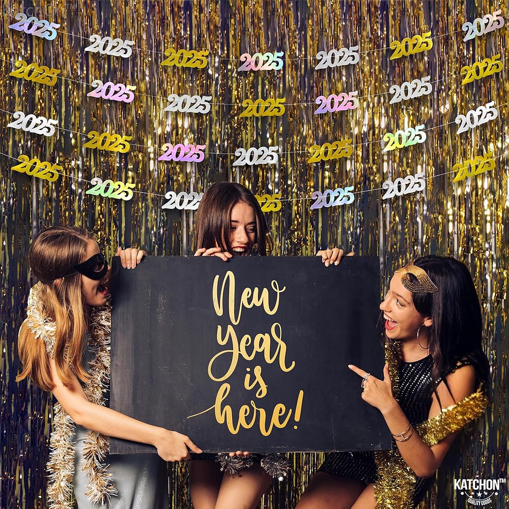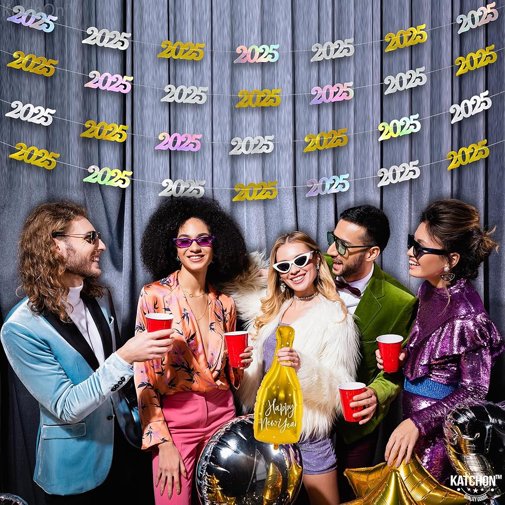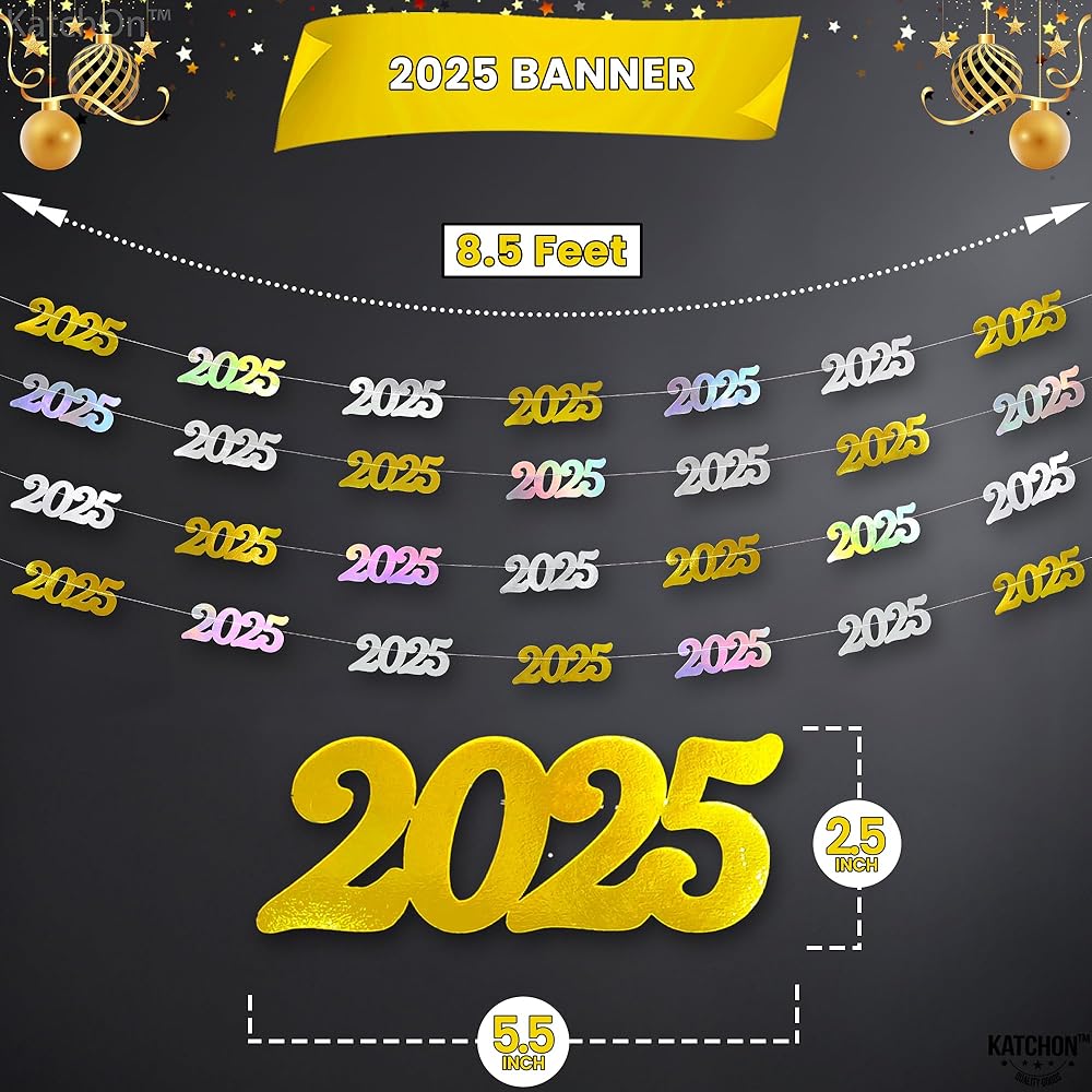PRE - STUNG | NO DIY REQUIRED | EASY TO HANG : This Iridescent 2025 banner can be decorated with ease as it comes pre-assembled, saving your time and effort. This new years banner comes in 4 strings of 10 Feet long. This happy new year banner 2025 is a great choice as a new years backdrop or happy new year door banner at entrance way for a luxurious happy new year decorations 2025. Add a festive vibe to your home with happy new year sign as happy new year hanging garland. A perfect happy new year 2025 garland.