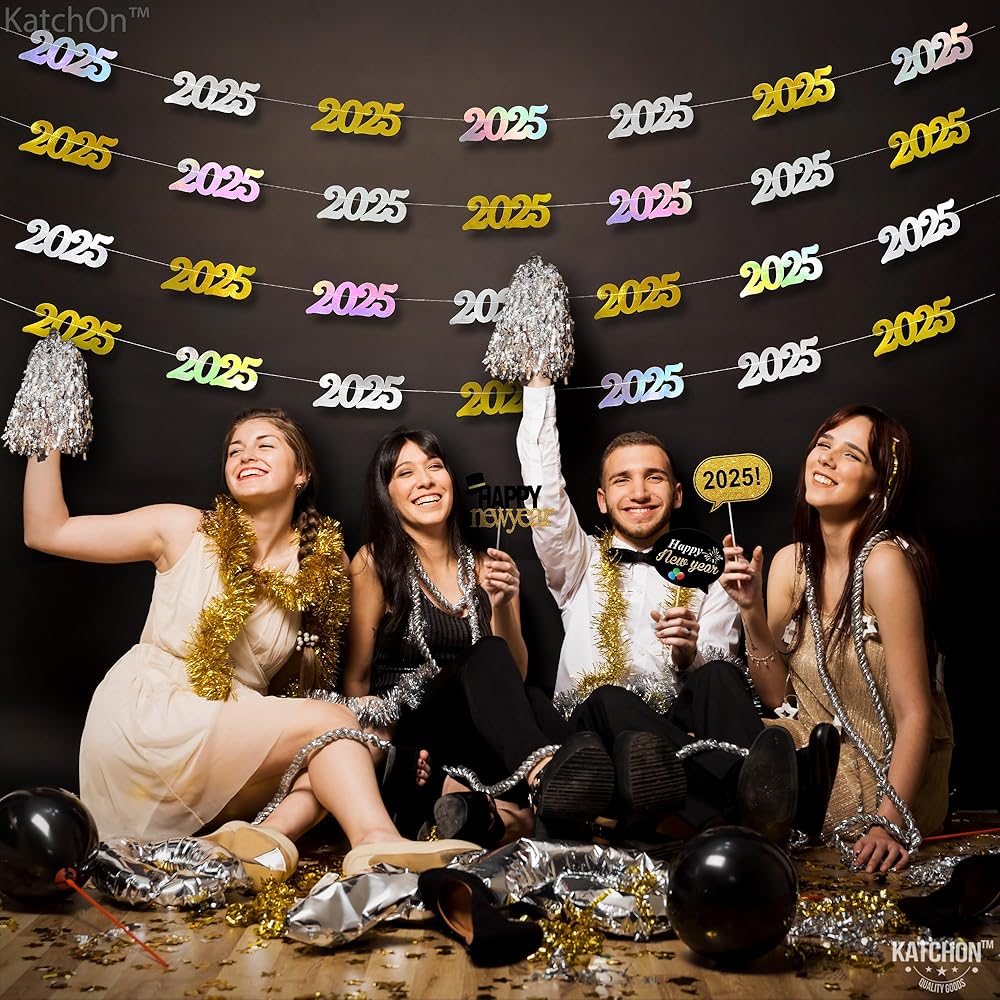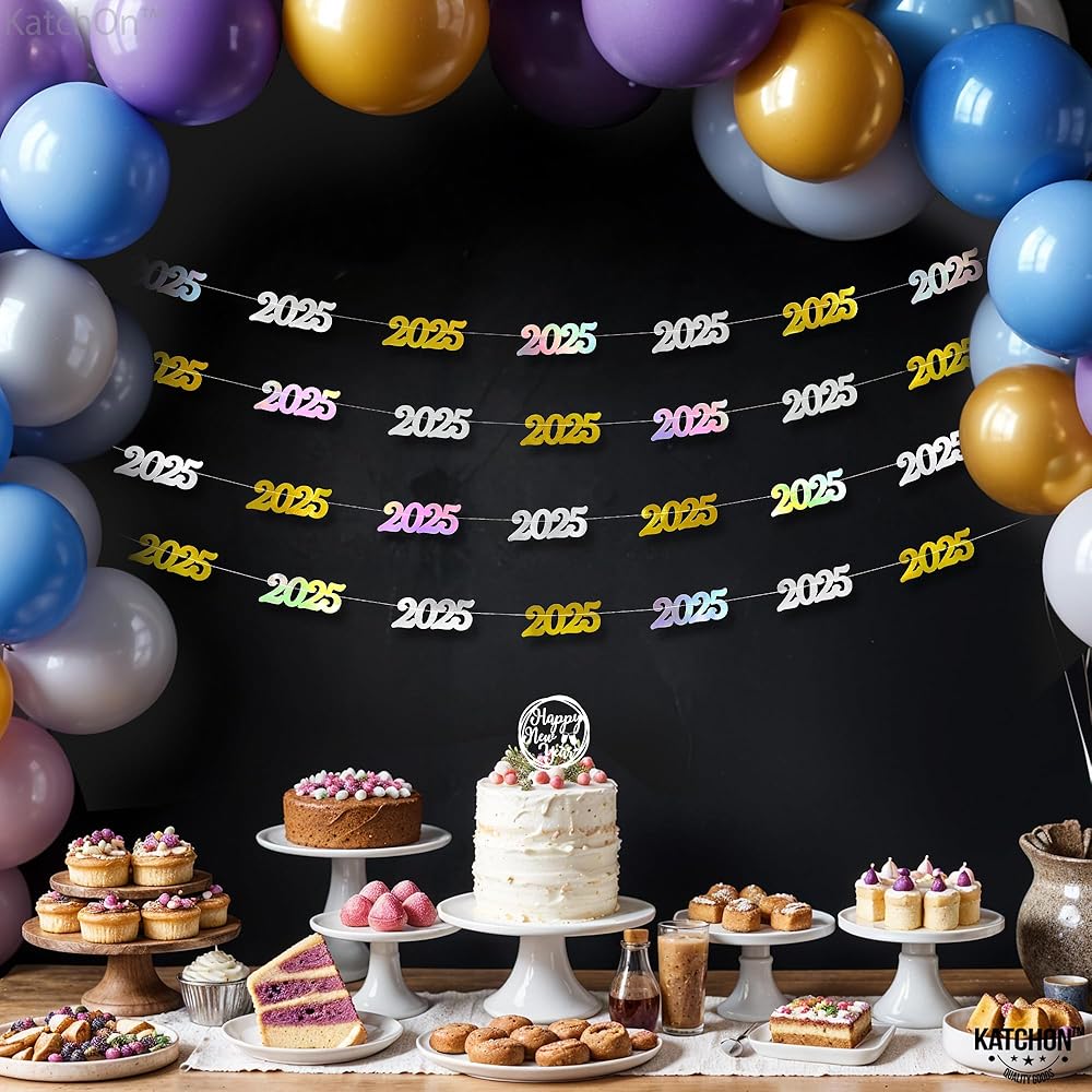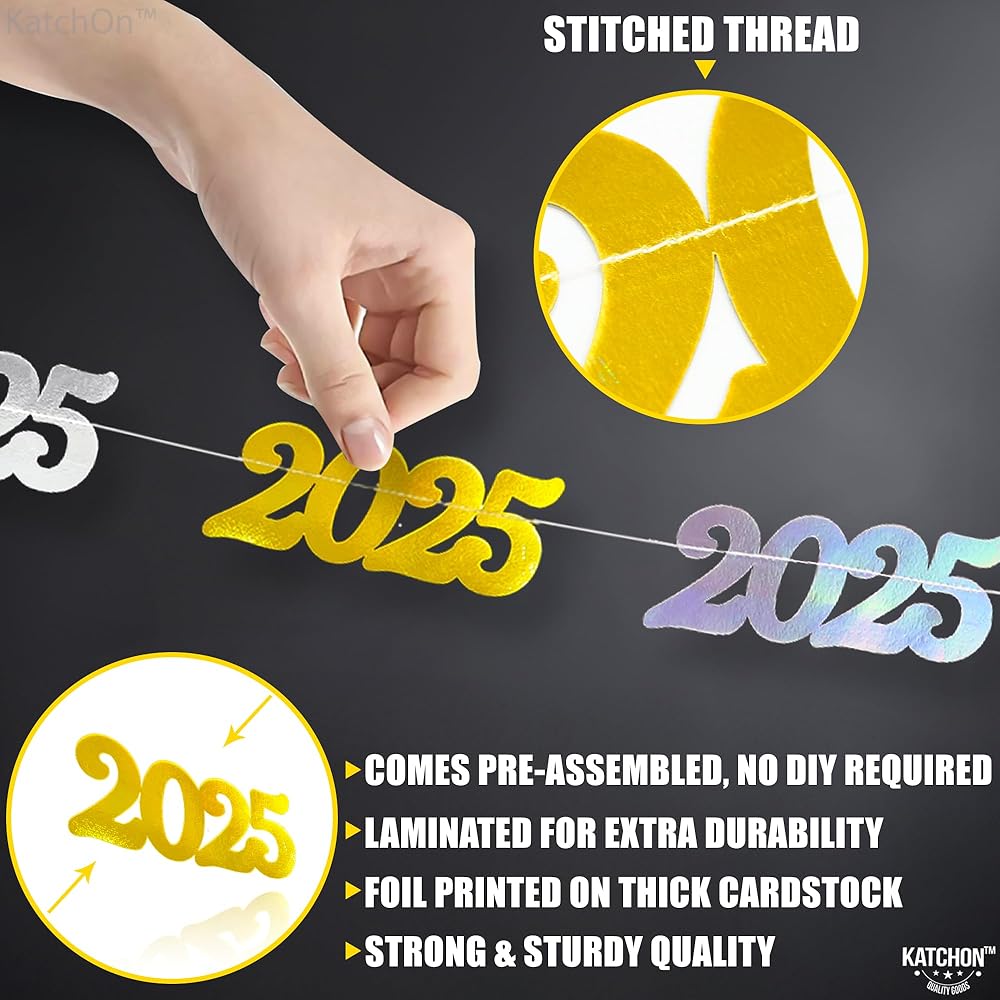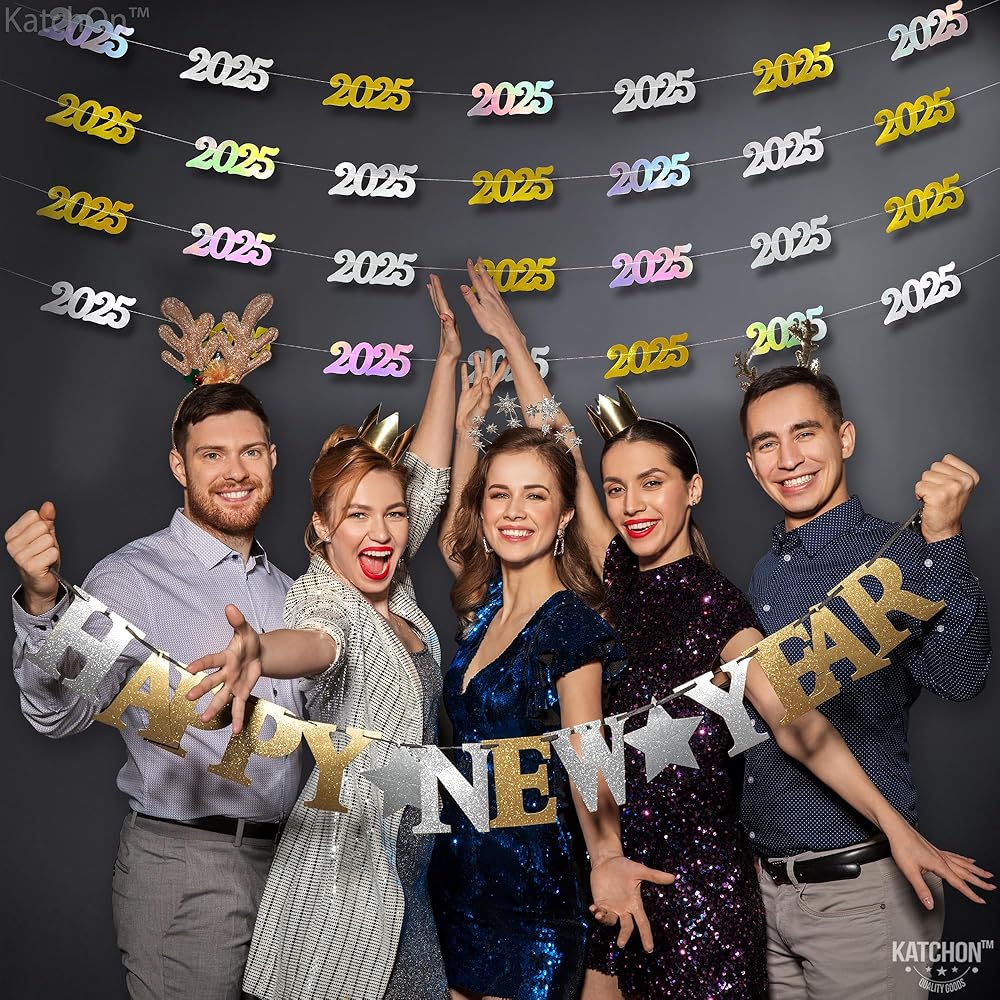 PRE - STUNG | NO DIY REQUIRED | EASY TO HANG : This Iridescent 2025 banner can be decorated with ease as it comes pre-assembled, saving your time and effort. This new years banner comes in 4 strings of 10 Feet long. This happy new year banner 2025 is a great choice as a new years backdrop or happy new year door banner at entrance way for a luxurious happy new year decorations 2025. Add a festive vibe to your home with happy new year sign as happy new year hanging garland. A perfect happy new year 2025 garland.
