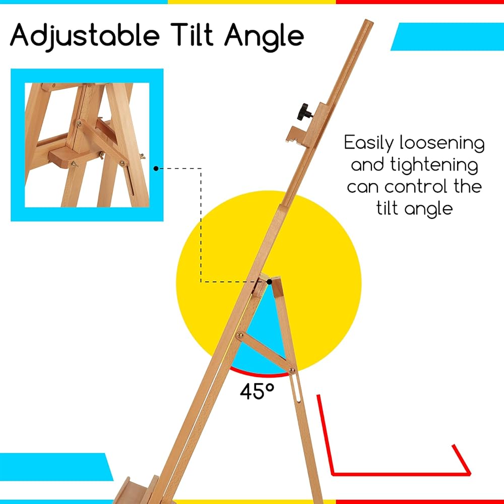 PAINT FROM ANY PERSPECTIVE: This easel stand is height adjustable, you can use the slider to make different position for displaying or painting, the height can be adjusted from 57-76inches. Meanwhile djusting the rear leg to meet 0-45°angles needs.