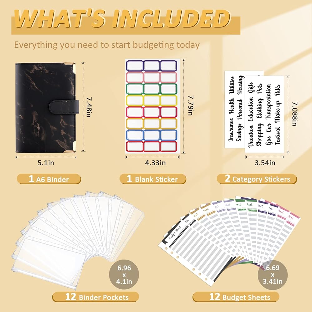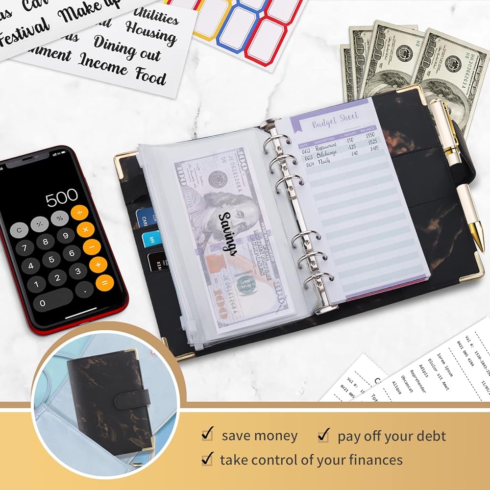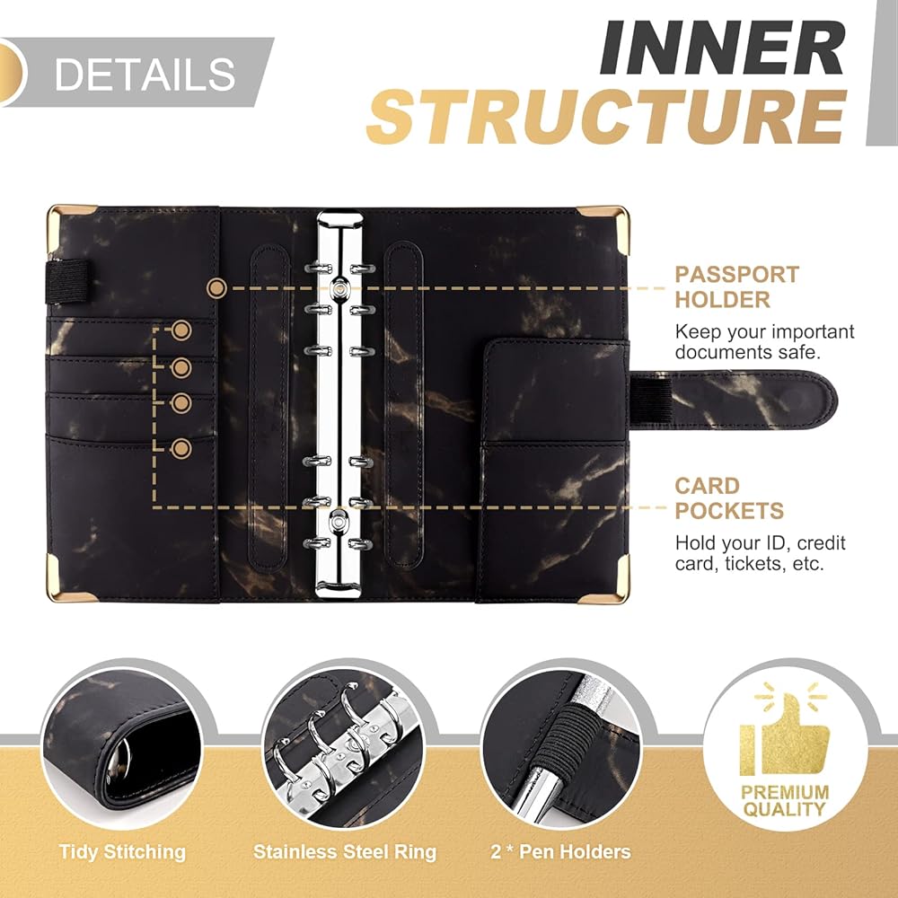Marble Budget Binder:Money saving binder made from durable PU leather. A6 binder has attractive marble cover and magnetic buckle. The gold metal trim can protect corners from wear and tear while adding a luxurious and elegant feel to the money organizer for cash