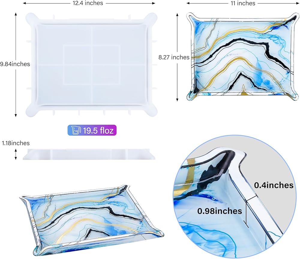 【Large Size and Precise Resin Volume】The large tray silicone mold measures approximately 12.4 x 9.84 x 1.18 inches, with a finished product size of about 11 x 8.27 x 1 inch. Perfect for coffee trays, tea trays, and makeup trays. Each mold requires approximately 19.5 fl.oz of resin, and resin volume markings are engraved for your reference. Suitable for professional resin artists, beginners, and anyone passionate about resin art.