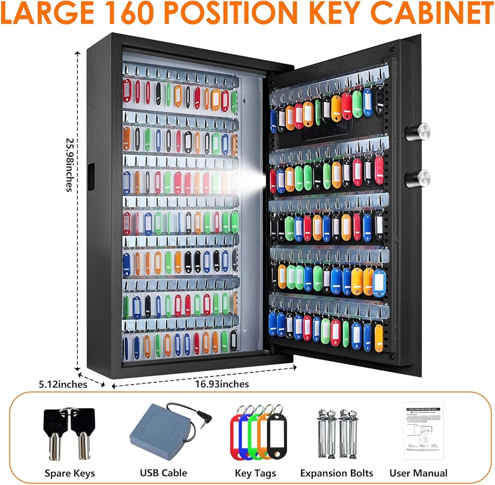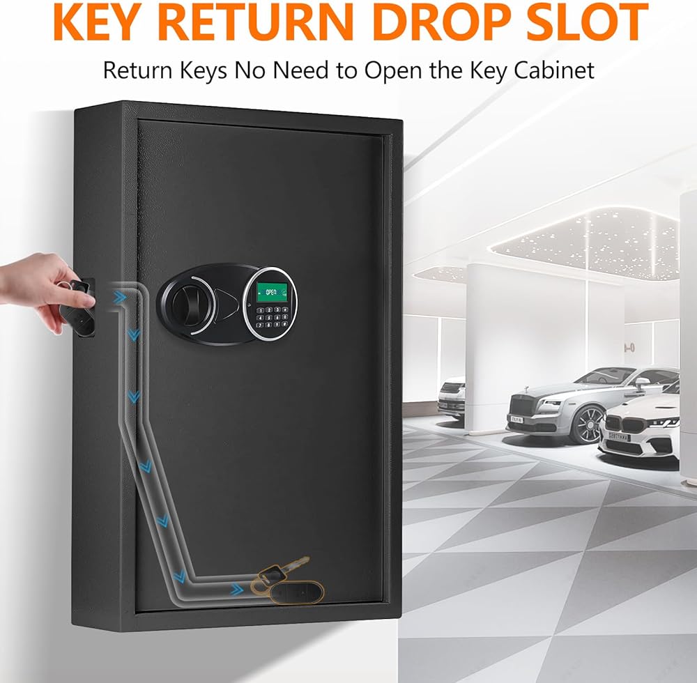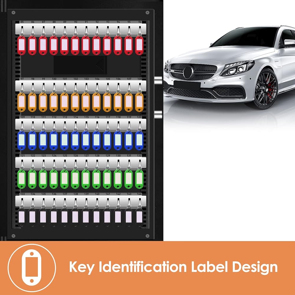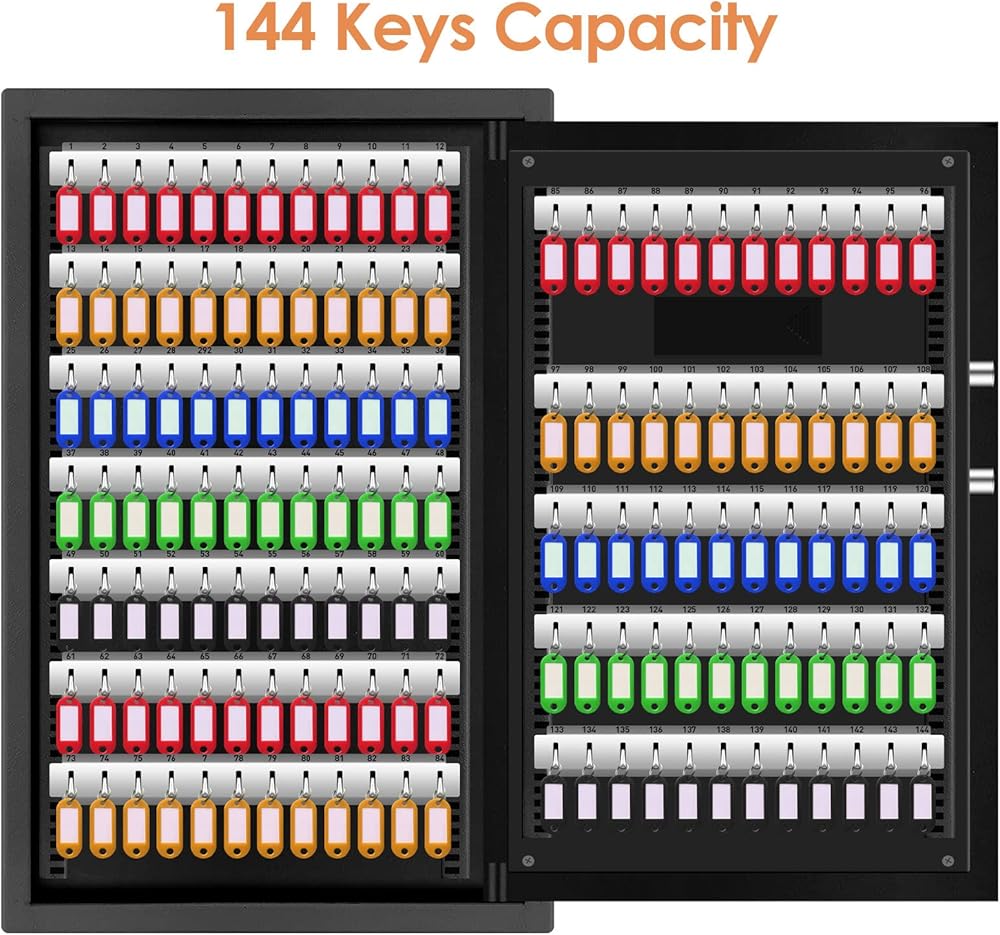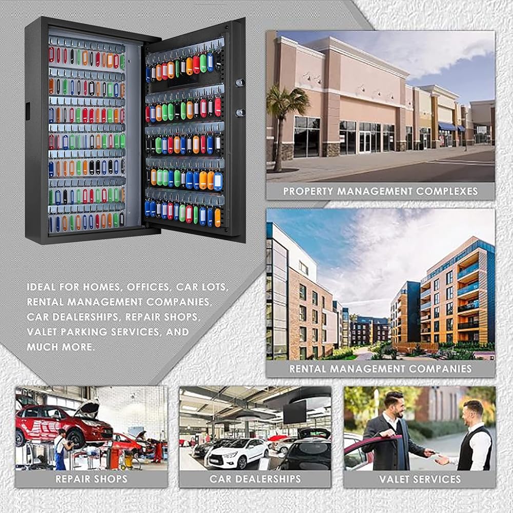 🔥🔥🔥【LARGE KEY STORAGE WITH KEY TAGS】:Our key lock box provides convenient and secure organization for 220 keys. It also features a depth to accommodate larger key rings so you no longer have to remove keys from their rings in order for them to fit inside. The tags included hold the keys flat and makes it easy to find what you are looking for.