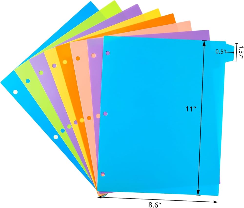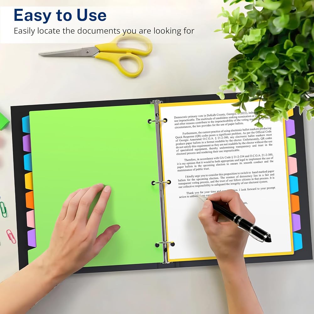 Dividers for 3 Ring Binder, Letter Size: The size of binder dividers with tabs is 11 x 8.6 inches, designed to fit standard letter size paper for efficient file organization. The large tabs improve visibility and facilitate writing.