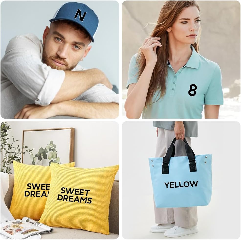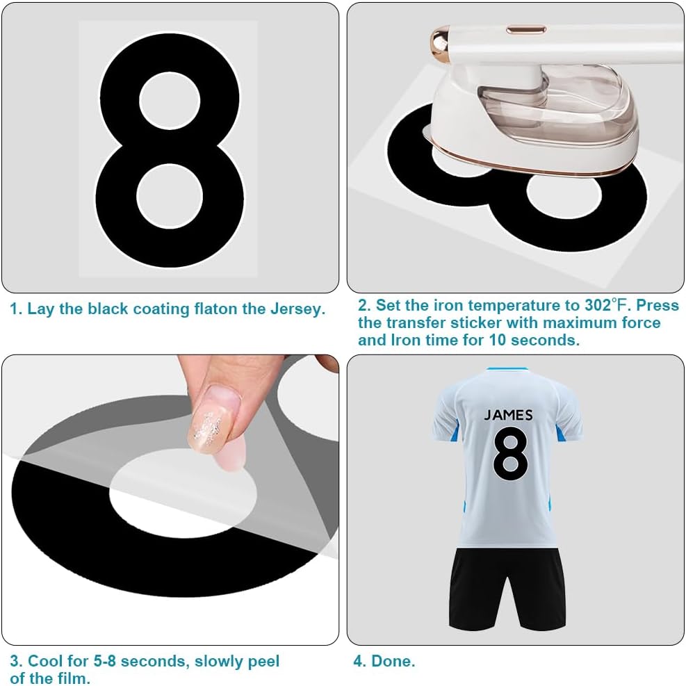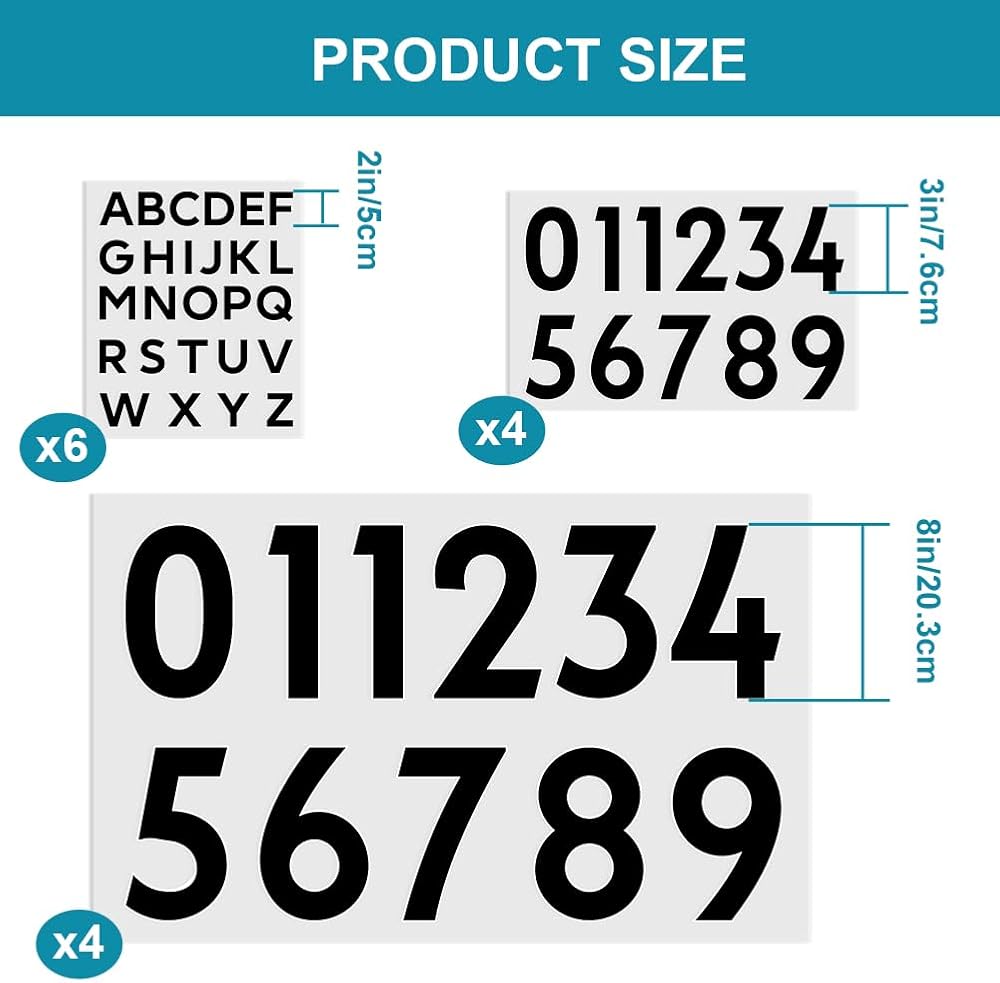 Each heat transfer number set contains 6 sets of 2-inch letters (26 letters per set), 4 sets of 3-inch numbers (11 per set), and 4 sets of 8-inch numbers (11 per set), a total of 244 Pcs Package Include: 244 Pcs iron on numbers and letters