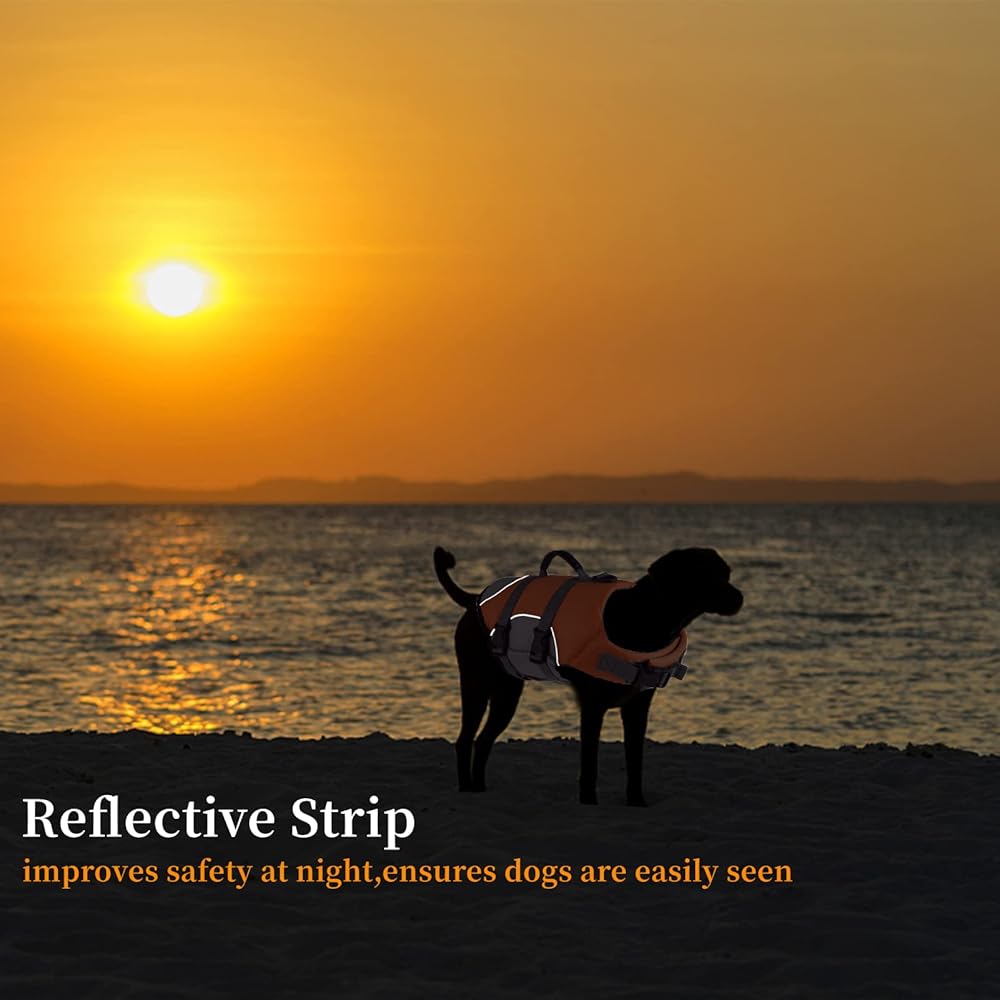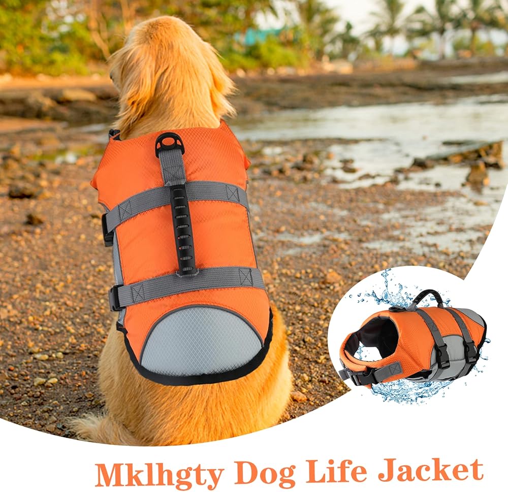 【RESCUE HANDLE & D-RING】Mklhgty dog life preserver helps your dog better stay safe in the pool, beach or boating. If you're on a boat and your dog slips overboard, you can quickly hold the handle on the top to rescues. D-ring is usually located near the base of the handle and gives you a spot to secure a leash, in the event that you remove your dog's collar while using the life vest.