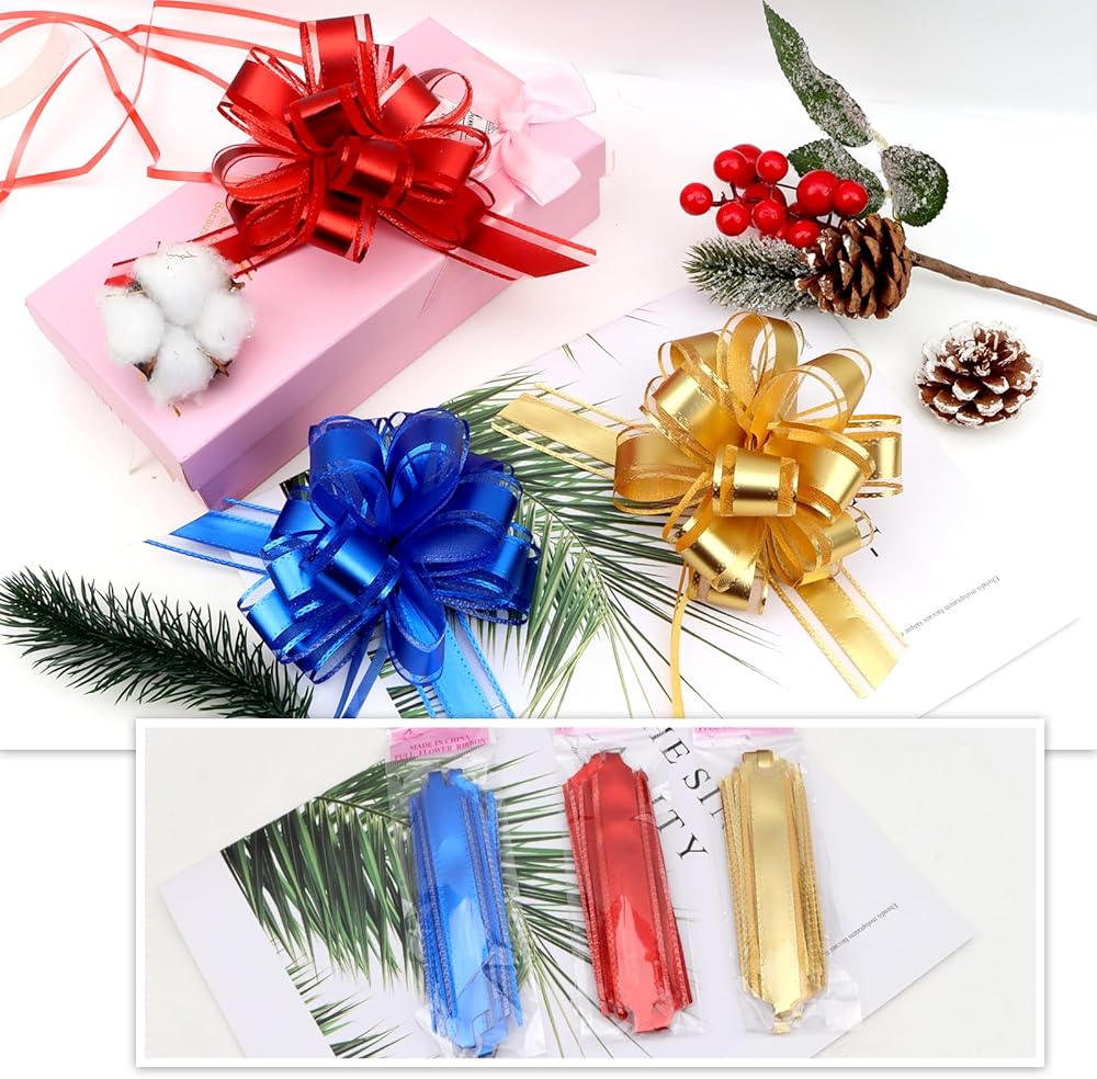 Easy to Use:Each gift wrapping bow consists of many bow parts and firmly fixed by plastic rings, both sides have loose ribbons,just pull a ribbon slowly,then hold the other ribbon a nice bow comes out.