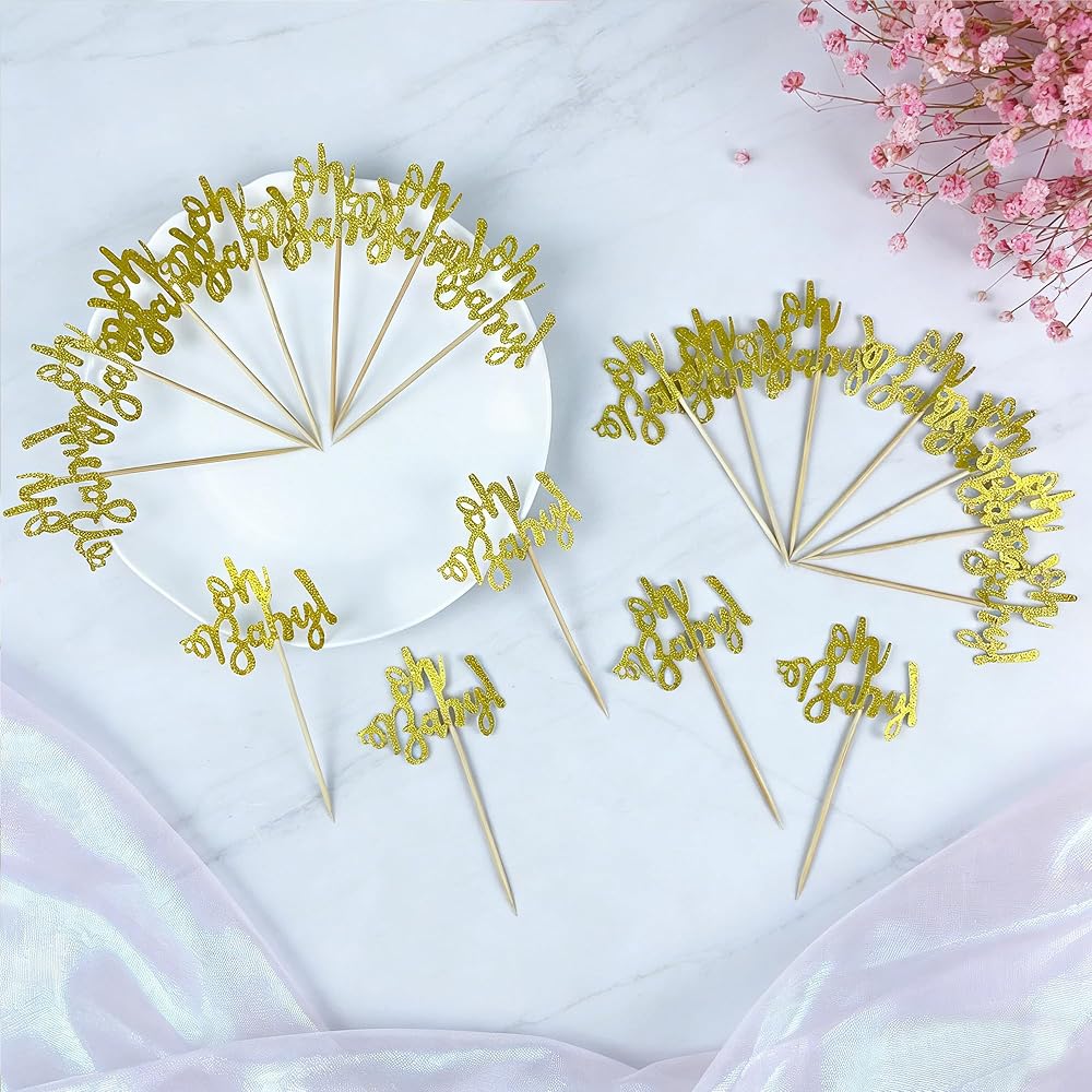 24 Gold Glitter Oh Baby Cake Cupcake Toppers Picks for Wedding Birthday Baby Shower Party Decorations
