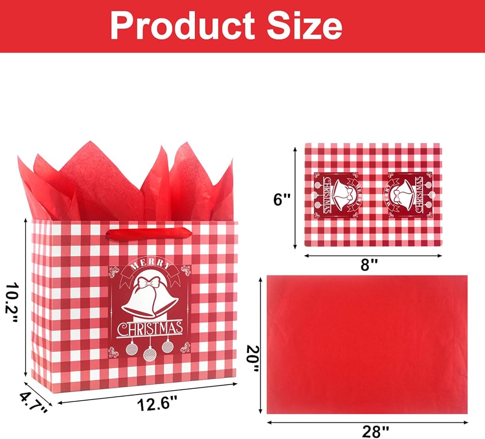 Size: 12.6" W x 10.2" H x 4.7" D Christmas gift bags, suitable for most sizes of gift packaging, can be used as holiday goodies bags, shopping bags, candy bags, treat bags, toy bags, or daily storage bags
