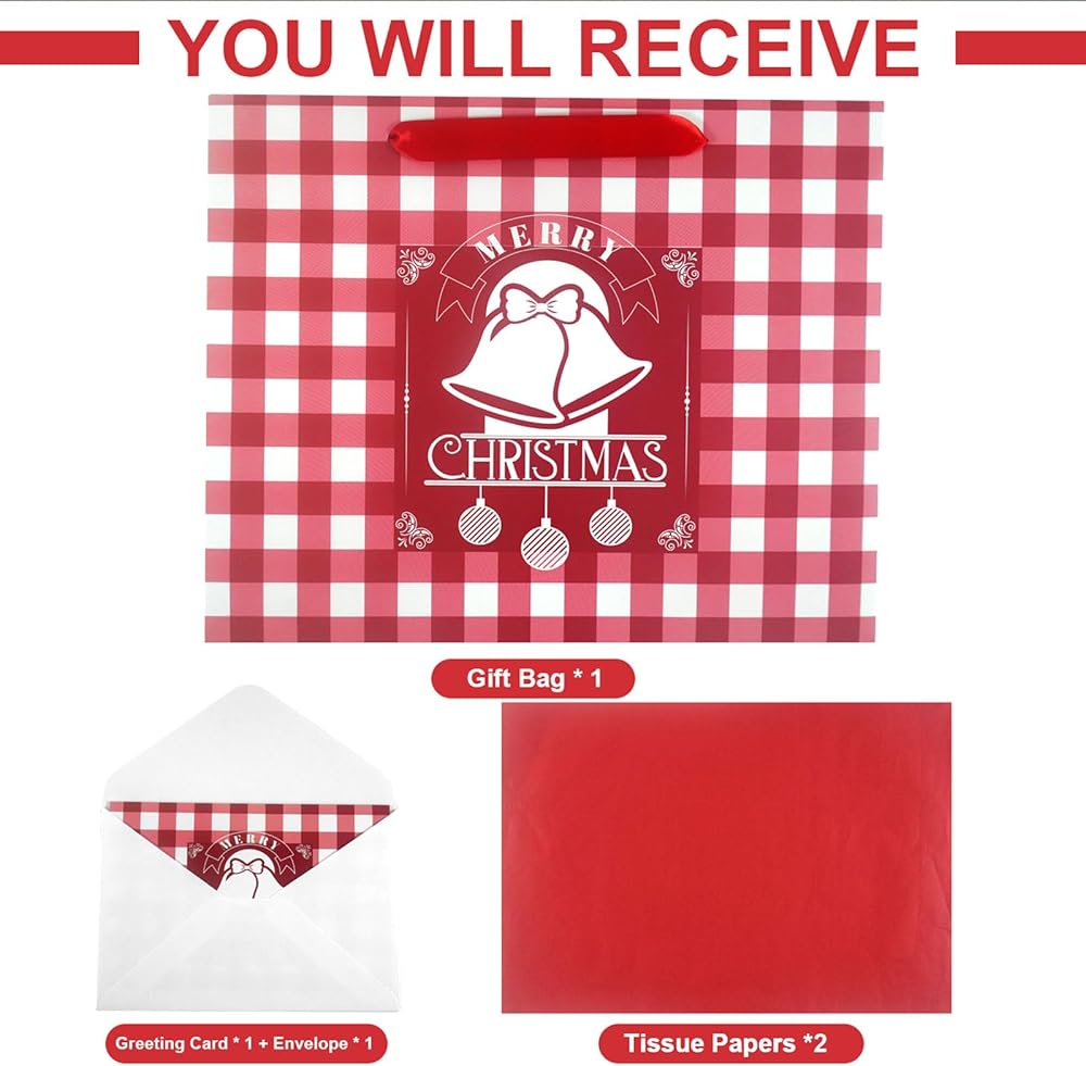 Bundle Includes: 1 Christmas Gift Bag, 1 Greeting Card, 1 Envelope, 2 sheets of Wrapping Papers.