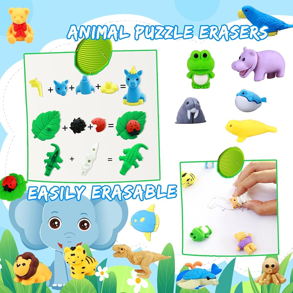 Puzzle 3D Cute Erasers: 58 Pcs creative 3D animal desktop erasers are lifelike and cute! Each eraser is special designed to look like a real critter on paper, adding infinite fun and vitality to your child's desk