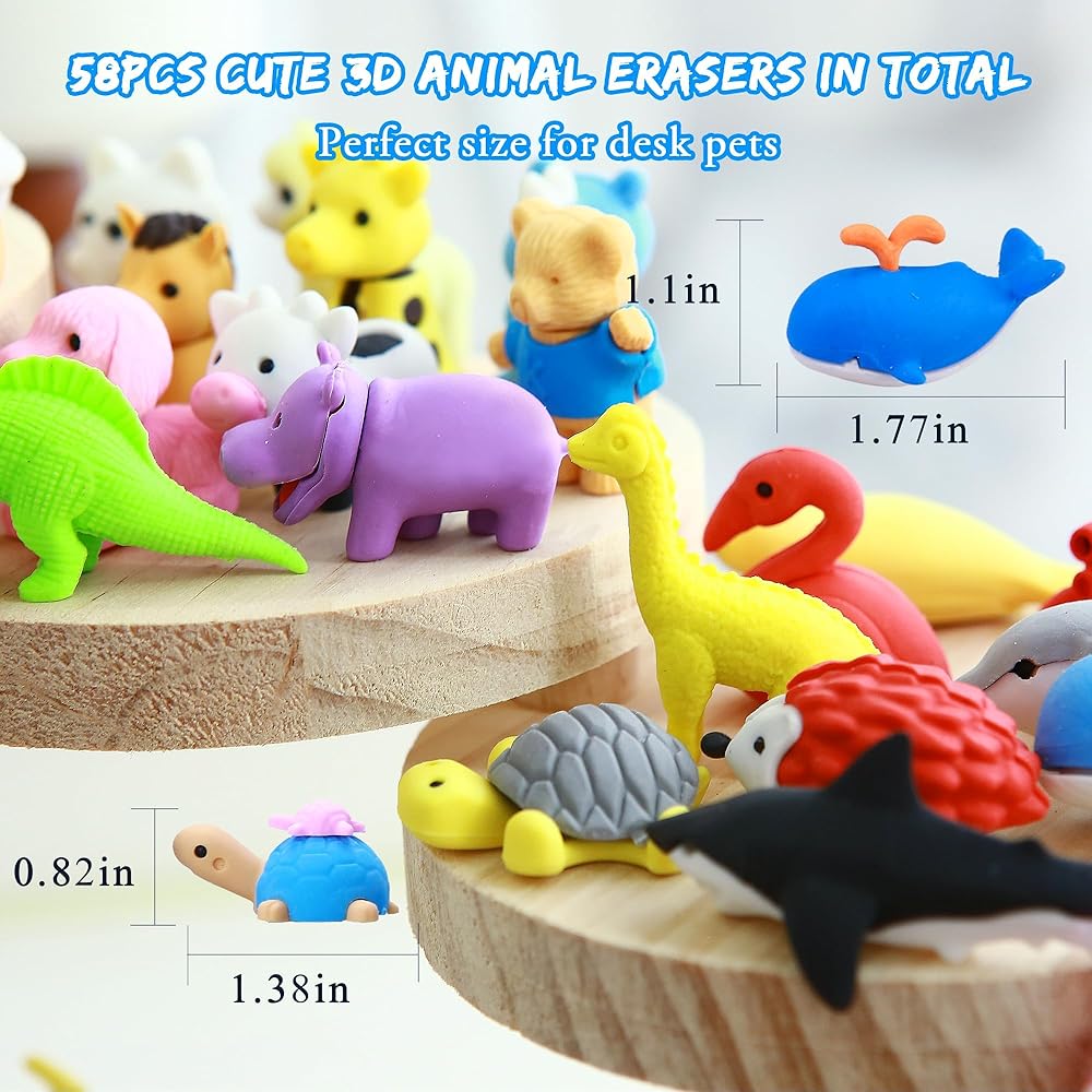 58 Pcs Animal Erasers Desk Pets Mini 3D Erasers Bulk Gifts for Classroom Prizes Game Rewards Treasure Box Party Favors Easter Egg Fillers Goodie Bag Stuffers