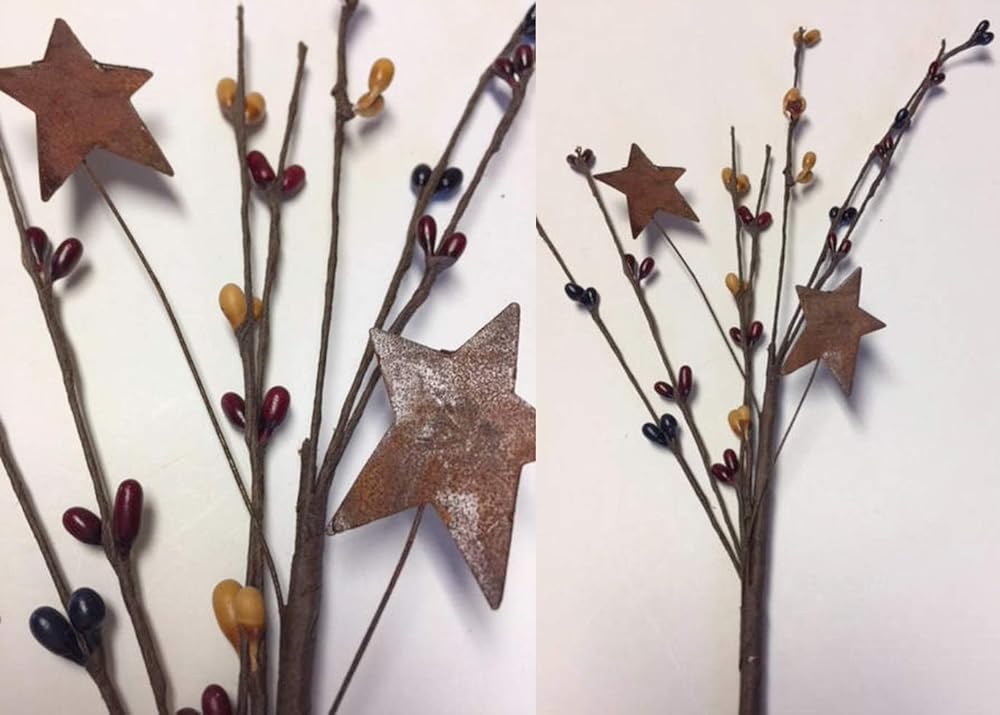 The pip berry pick combines burgundy, navy blue and old gold pip berries with two 1 Inch rustic tin stars to create a rustic colonial accent. This 12 Inch pick can be used for a colonial look in wreaths, floral arrangements, vases and as decorations with the ribbon on packages and with any other ideas that come to mind. Color: Burgundy, Navy Blue and Old White 12 inches long (approximately) 9 berry strands per pick 2 rustic stars per pick