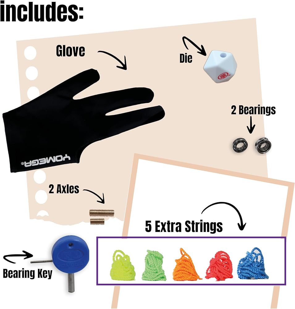 INCLUDES: 1 Pro x2 YoYo, 1 Bearing Key, 1 Dice Yo-Yo Counterweight, 2 Bearings, 2 Axles, Glove, 1+5 Kitty Strings, Tin Can