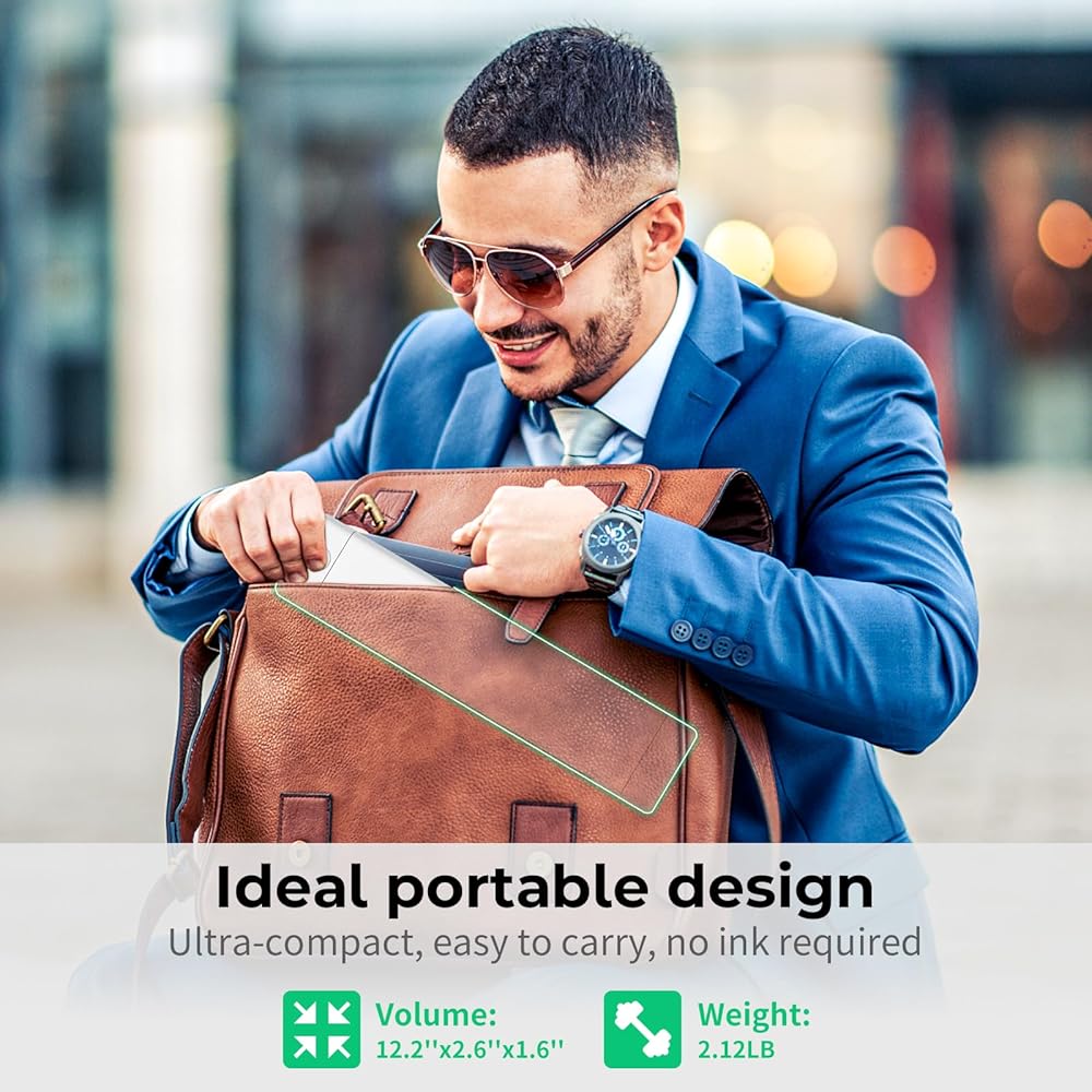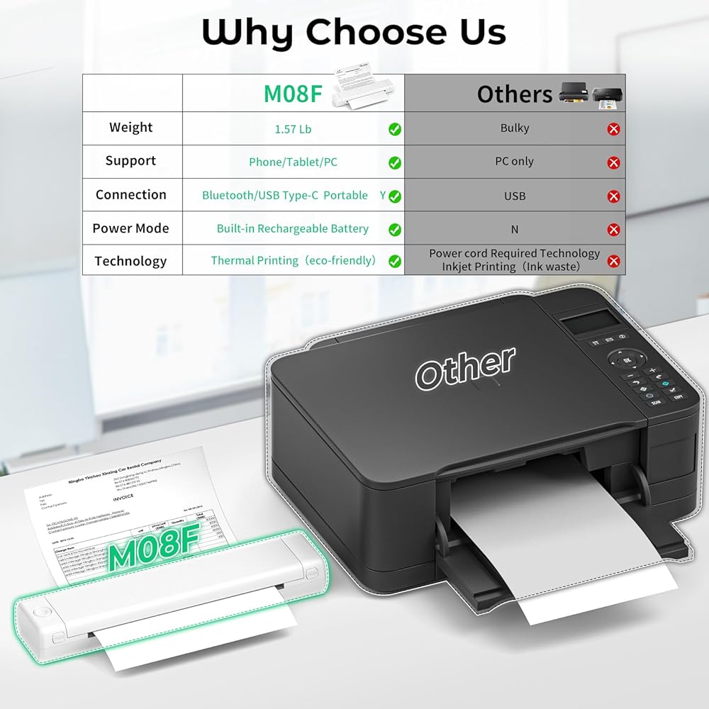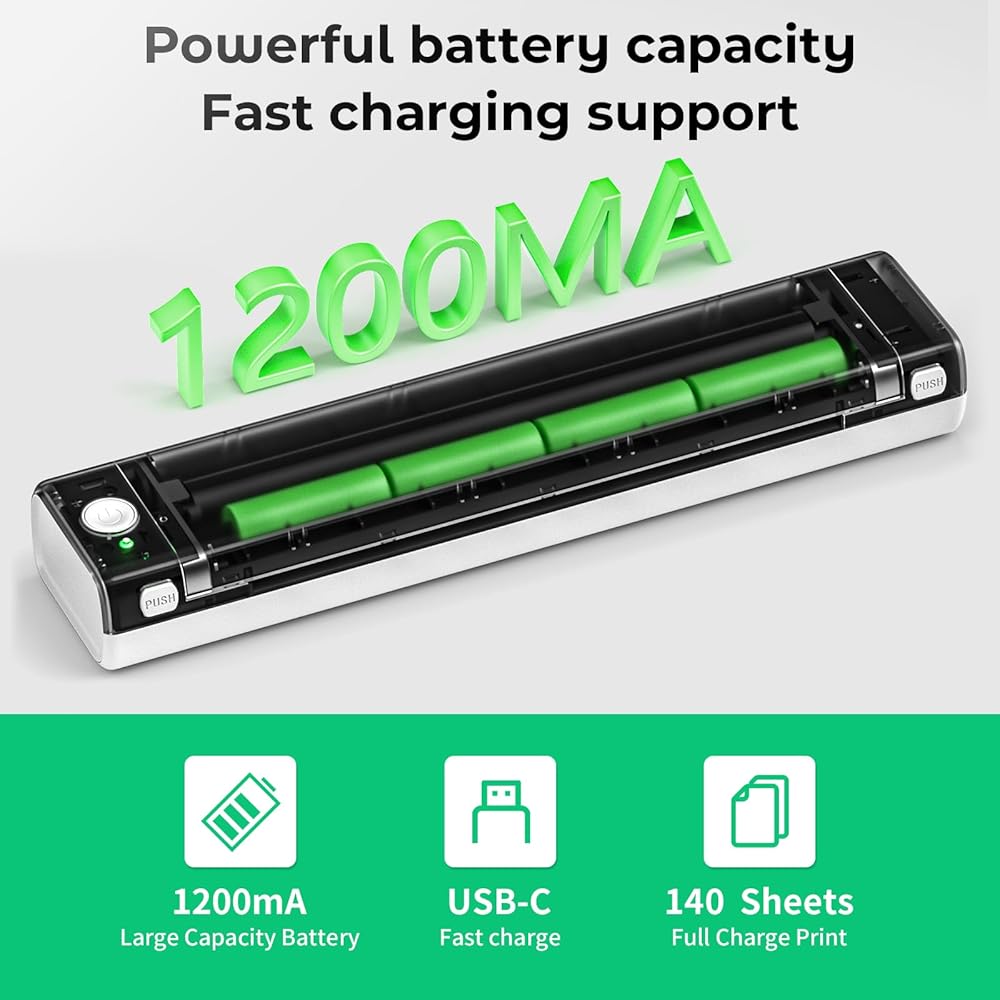 Extended Battery Life for Continuous Use: With a built-in 1200mAh lithium battery, M08F inkless portable printer supports up to 140 sheets of 8.5" x 11" US thermal letter paper printing, or 16-20 hours of continuous use. It's compatible with many chargers, ensuring you're never caught off guard by low battery