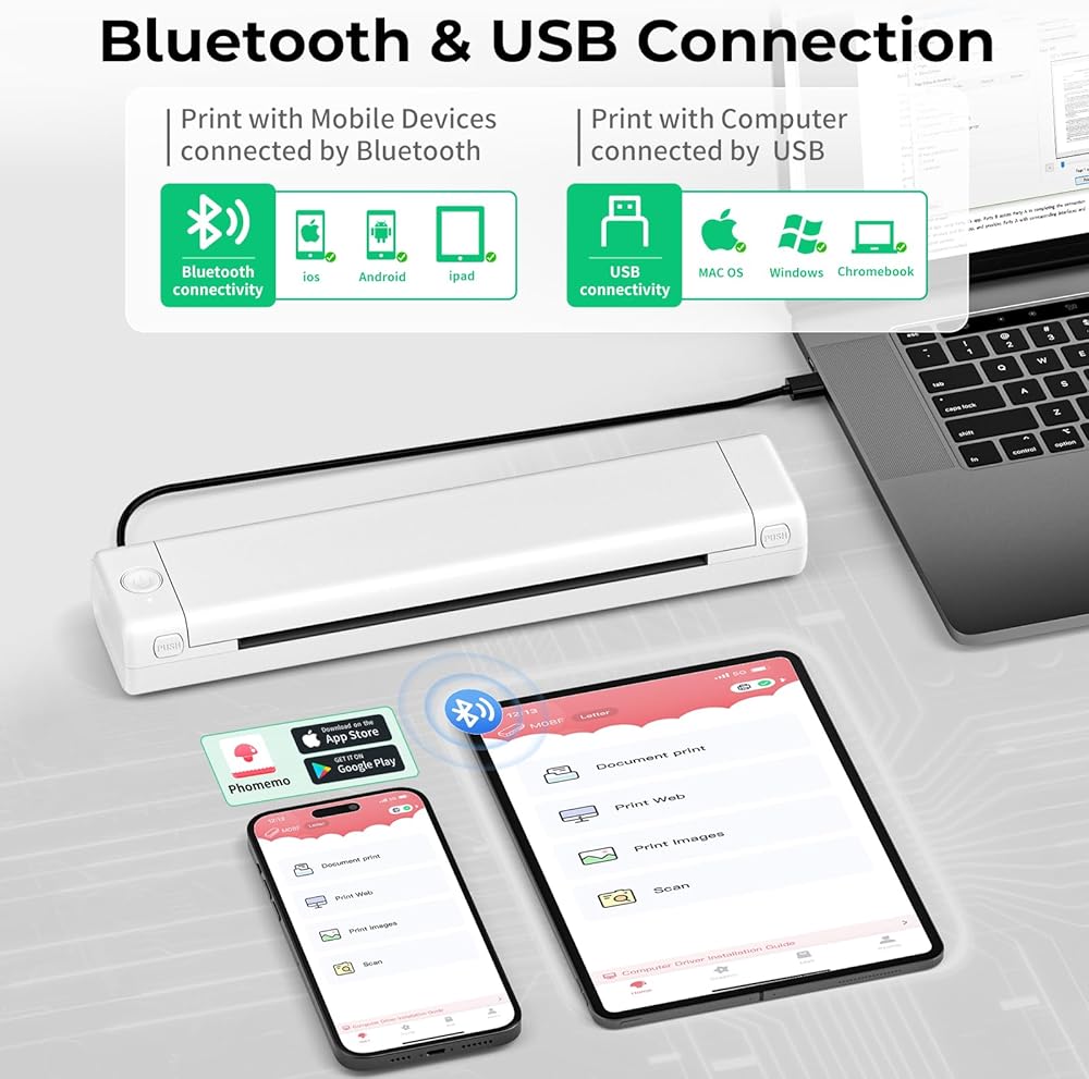 Bluetooth Connectivity for User-Friendly Operation: Compatible with the "Phomemo" app, this wireless printer offers Bluetooth connectivity for smartphones and tablets, ensuring a user-friendly operation. Also supports USB connections to computers for high-quality, clear prints on thermal paper
