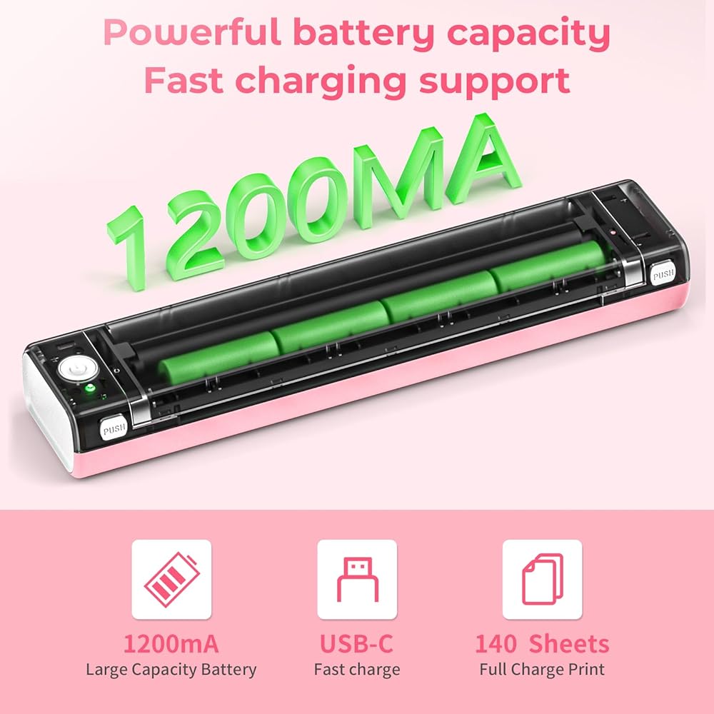 Extended Battery Life for Continuous Use: With a built-in 1200mAh lithium battery, M08F inkless portable printer supports up to 140 sheets of 8.5" x 11" US thermal letter paper printing, or 16-20 hours of continuous use. It's compatible with many chargers, ensuring you're never caught off guard by low battery